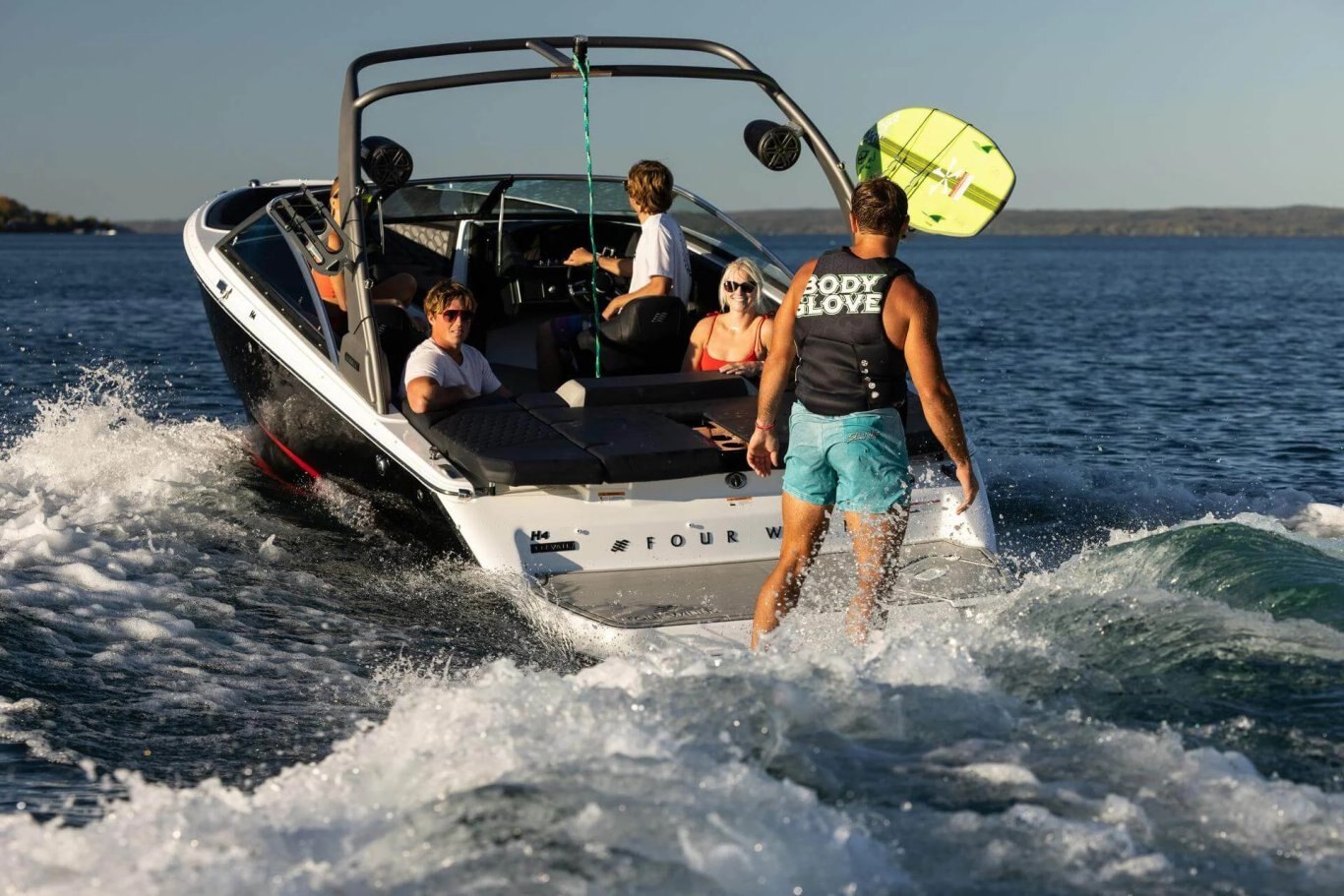 REFINED COMFORTThe H4 Surf elevates comfort to new heights with thoughtful design details. The swim platform mats are soft yet grippy, while the woven cockpit flooring adds a refined touch. Every inch reflects Four Winns' dedication to exceptional craftsmanship, from the hand-sewn stitching to the gleaming metal trim and plush foam, all combining to create an unparalleled level of comfort. The new monochrome color scheme brings simplicity and freshness to the cockpit’s aesthetic. Premium materials, like cool-touch vinyl-wrapped handles, durable upholstery, and padded bow walls, enhance the experience with enduring comfort and sophisticated style. |