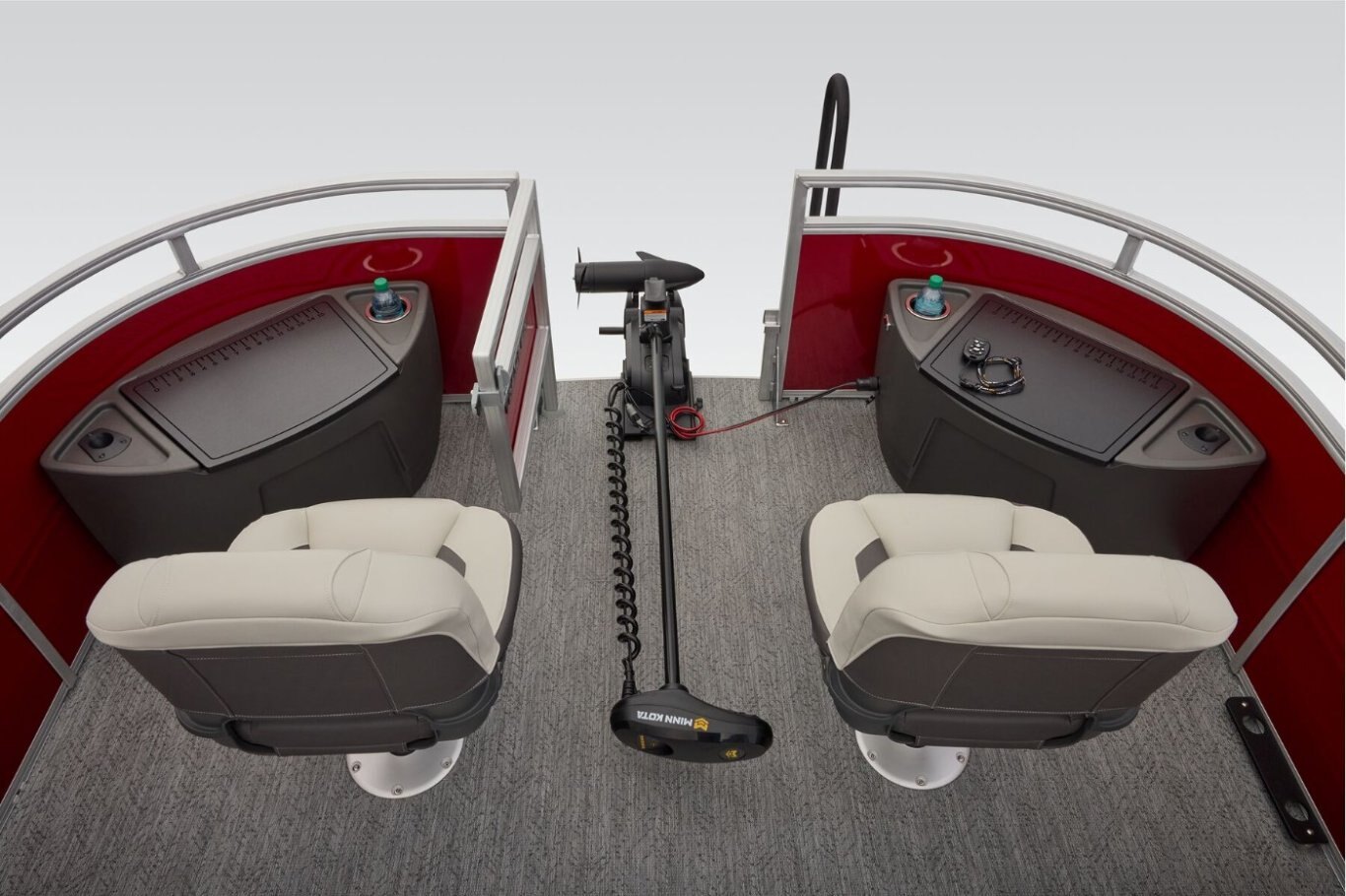 • Front fishing station w/2 pedestal seat base locations; rail-mounted rod & tool holders; & bow starboard storage compartment w/drink holder, rod holder & composite lid w/fish ruler