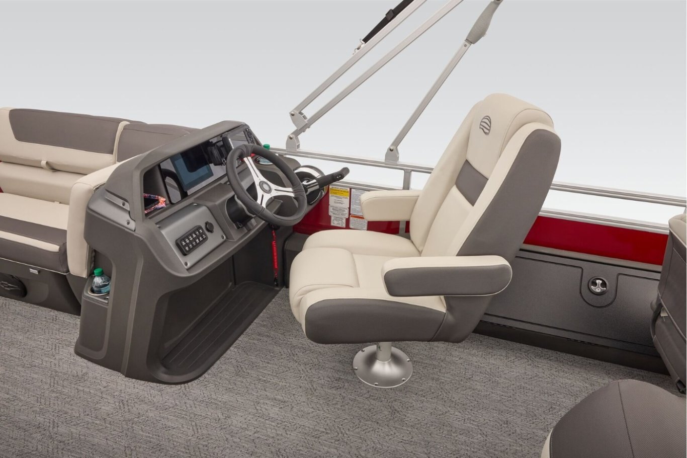 • Reclining, high-back swiveling helm bucket seat w/self-leveling armrests