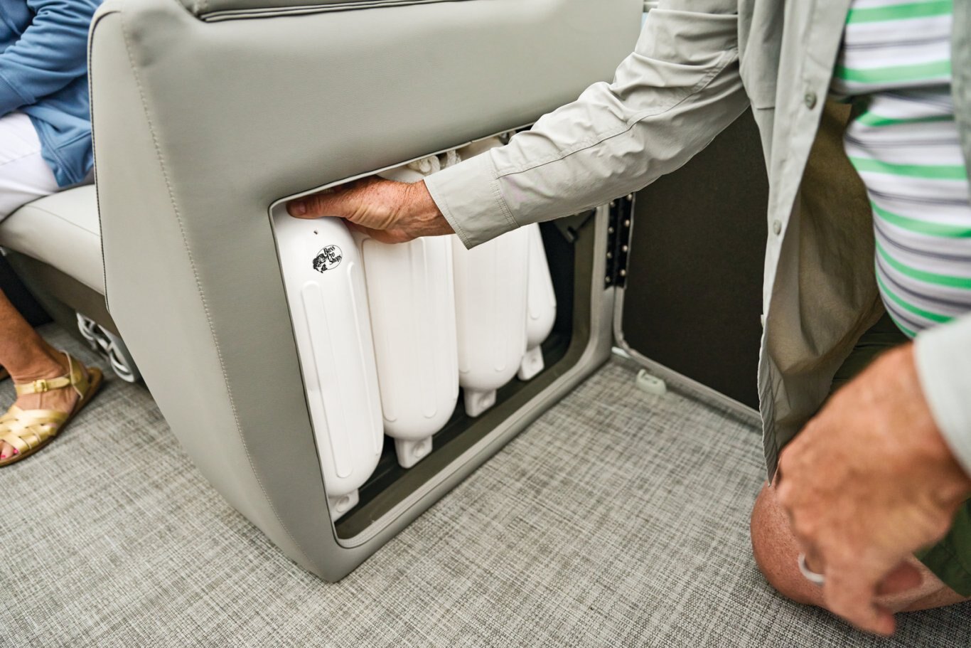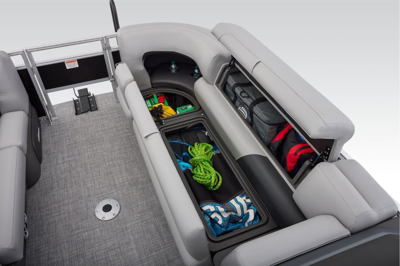 • Aft L-lounge couches w/STOW MORE™ & underseat, lockable storage