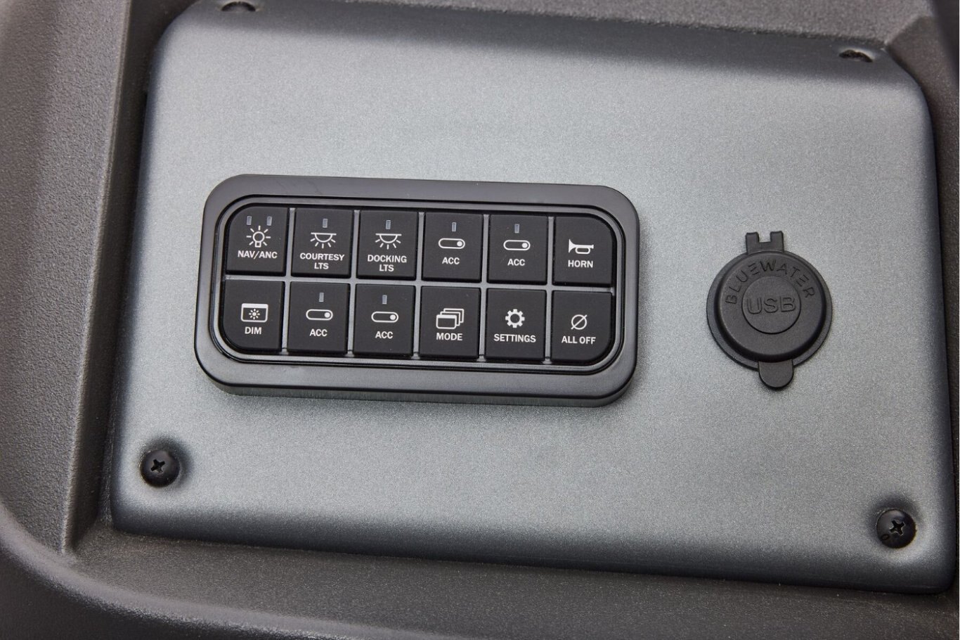 Bimini Top9' (2.74 m) Black Bimini top with LED courtesy lights, storage pockets and protective boot. |