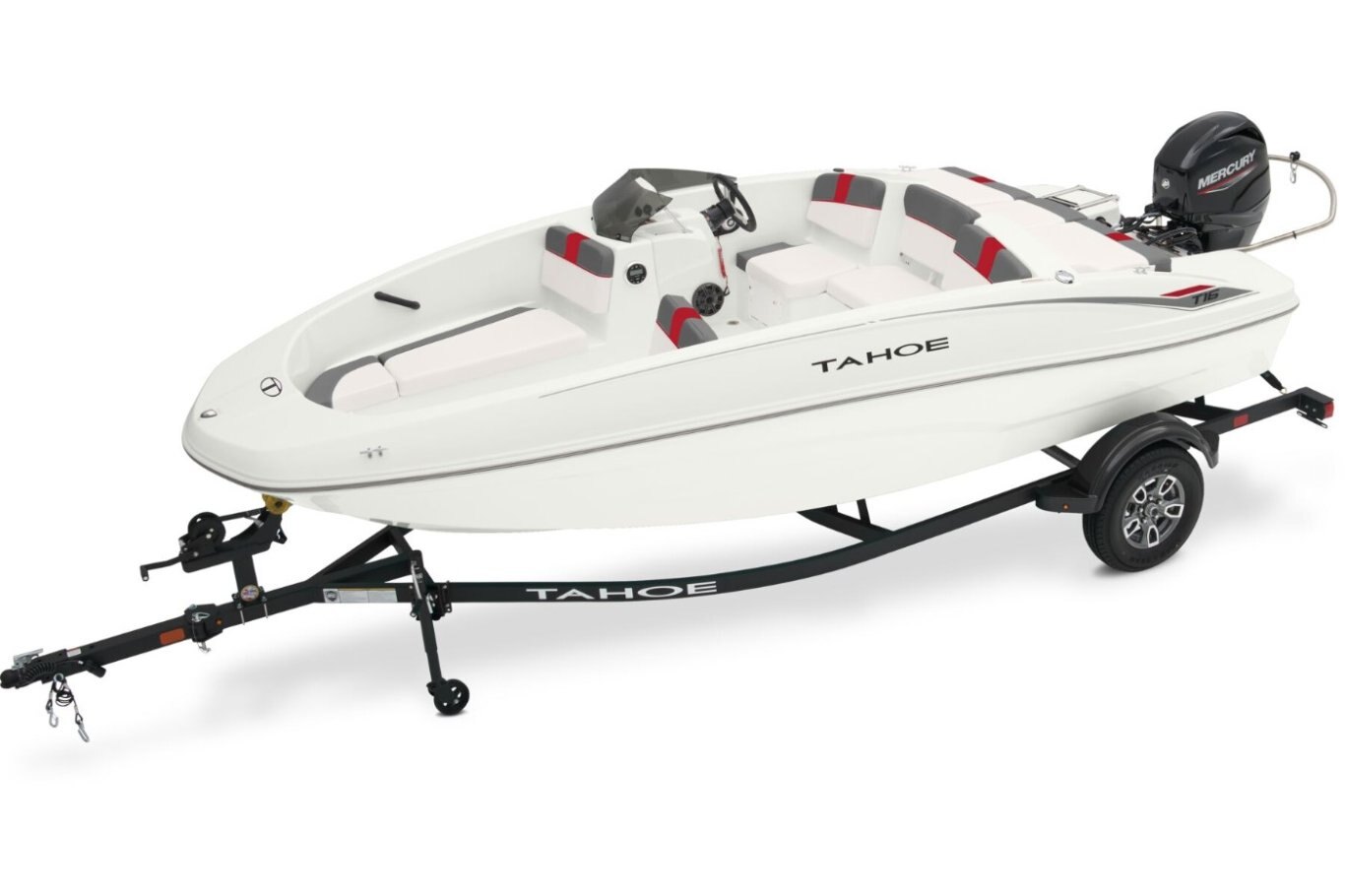 This affordable introduction to the TAHOE® family is a 6-passenger sports boat built to perform. Its POWERGLIDE® hull design features HYDROSTEP strakes that deliver exciting and stable riding experiences. Use the 7" TAHOE CRUISE touch screen to monitor GPS-accurate speed, water depth, your motor's vitals, and more. Opt for the available TurboSwing® to prepare your T16 for watersports. Relax on the water in this boat's midship bench seating and twin forward lounges with under-seat storage. The bow seats have reversible backrests that turn them into spotter seats. Lay out on the aft sun pad when you find your cove. The 4-step telescoping aft boarding ladder makes it easy to get back on the swim platform after diving into the water. Flip-up seat cushions and flip-down seat backs let passengers board the boat without stepping on upholstery. Claim 1 of the 9 drink holders, find your song on the 2-speaker Kicker® stereo, and search for excitement on the water! The 2026 TAHOE® T16 comes standard with a 60hp Mercury® ELPT FourStroke outboard motor and has a recommended maximum 75hp rating. This model is packaged with a trailer. |