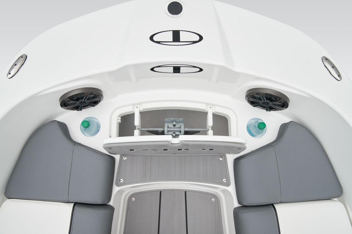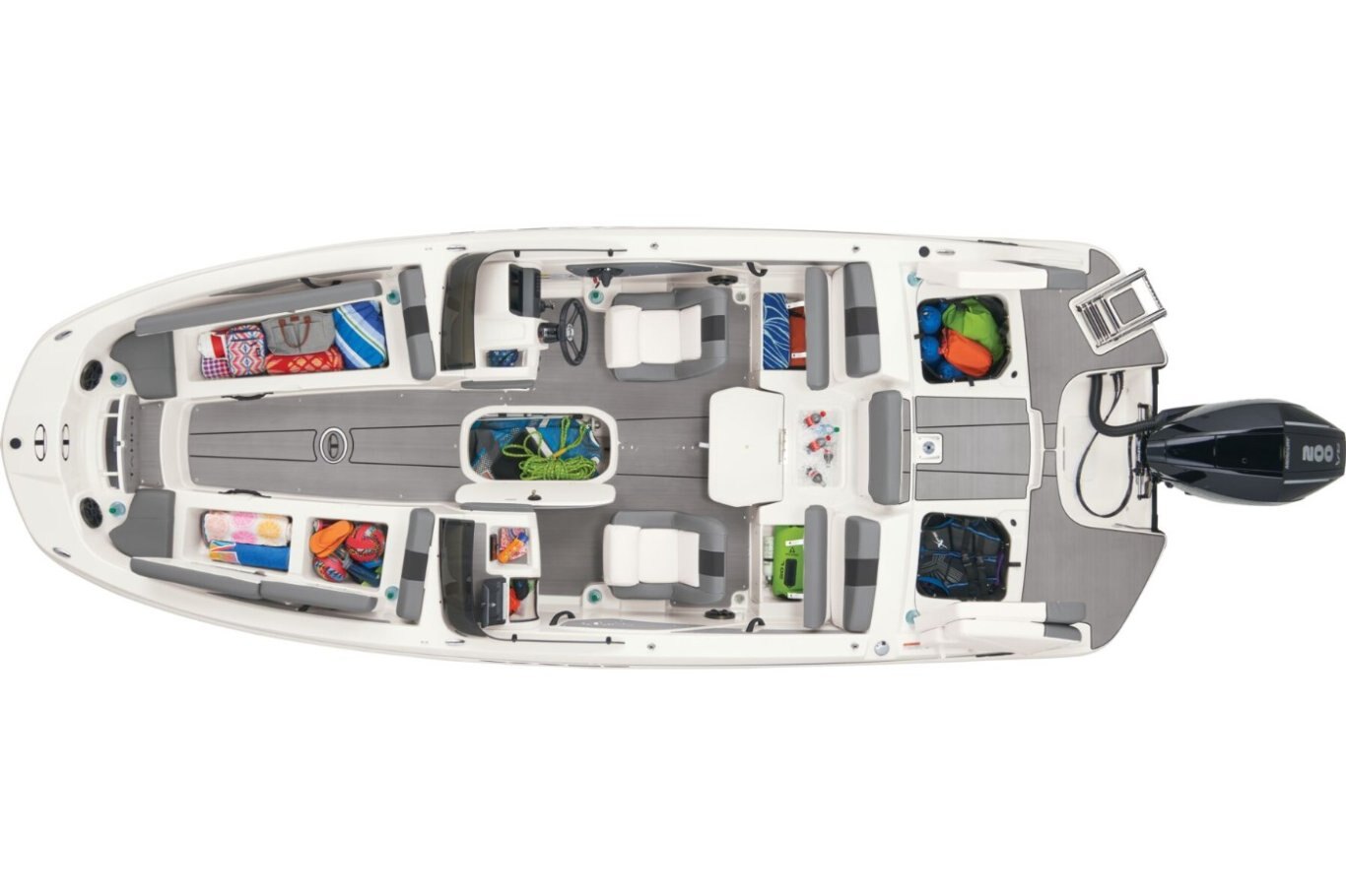 Take your places in the luxurious dual forward lounges, dual midship bucket seats, and the aft 3-across bench. You’ll find space for your gear and supplies under the seats and sun-pad cushions, consoles, and the in-floor storage compartment. When you’ve found a cove you want to explore, the anchor locker, dual aft swim platforms, and telescoping ladder make diving into the waters and getting back into the boat easy.