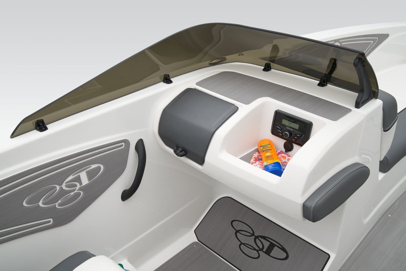 Fishing features option w/6-gal. (22.71 L) aerated livewell & livewell switch panel; 2 fishing seats w/pedestals & storage bags; added cockpit seat base location; 2 dual cockpit vertical rod holders; trolling battery charger; 2 group 27 battery trays; bow trolling motor mounting brackets & harness w/plug mounted to bow panel