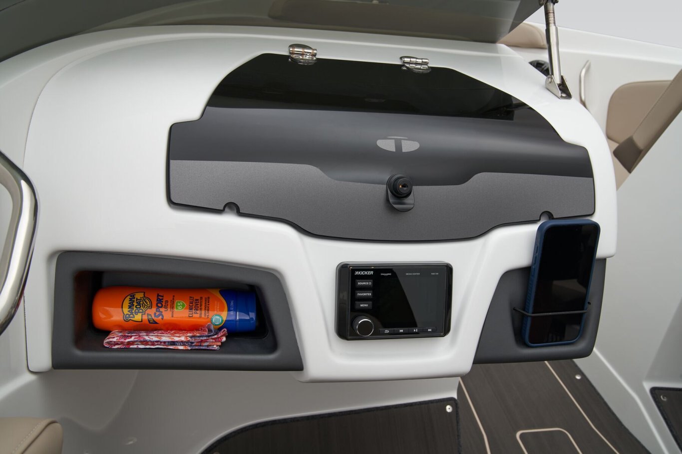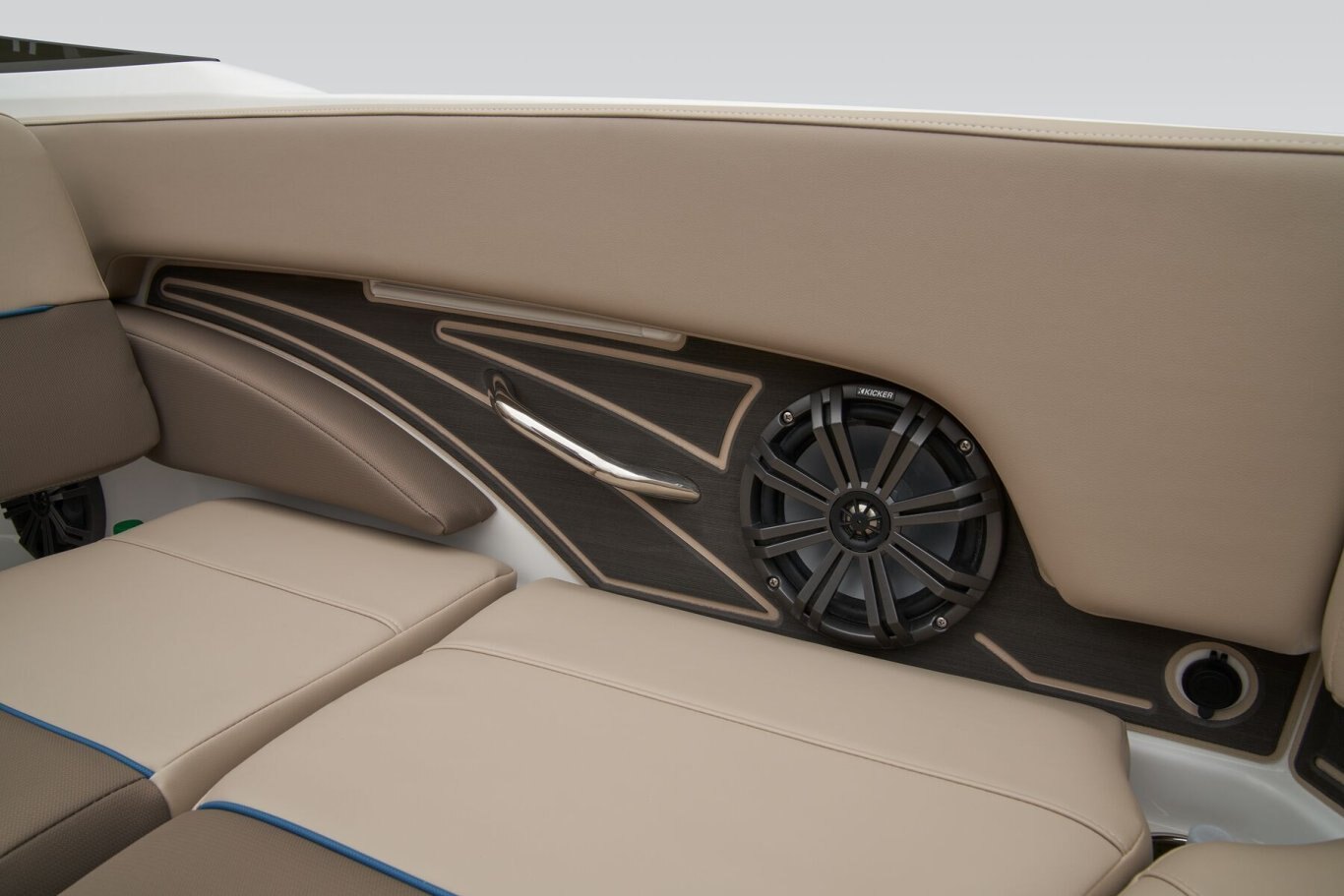 A removable ski-tow pylon makes it easy to prepare your boat for watersports. When it's time to take a break, relax on the dual aft swim platforms and play the songs of the summer through the 6-speaker Kicker® stereo with Bluetooth® compatibility. When the sun goes down, the fun goes on thanks to interior LED lighting perfect for night rides.