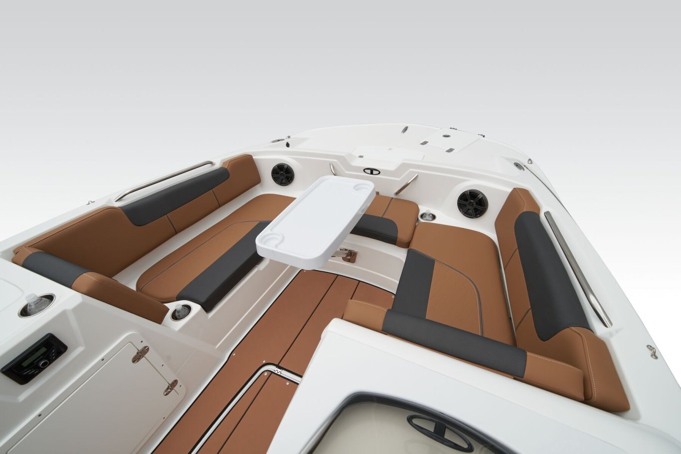 The ample lounges and benches hold a crew of 10. Stow gear, supplies, and more in the hidden storage compartments under the seats and elsewhere. Keep the drinks and snacks cold in the removable 25-qt. cooler. A standard bimini top helps you cool off when the sun is high. This model's removable aluminum ski-tow pylon and in-floor wakeboard/ski storage makes preparing for watersports a snap.
