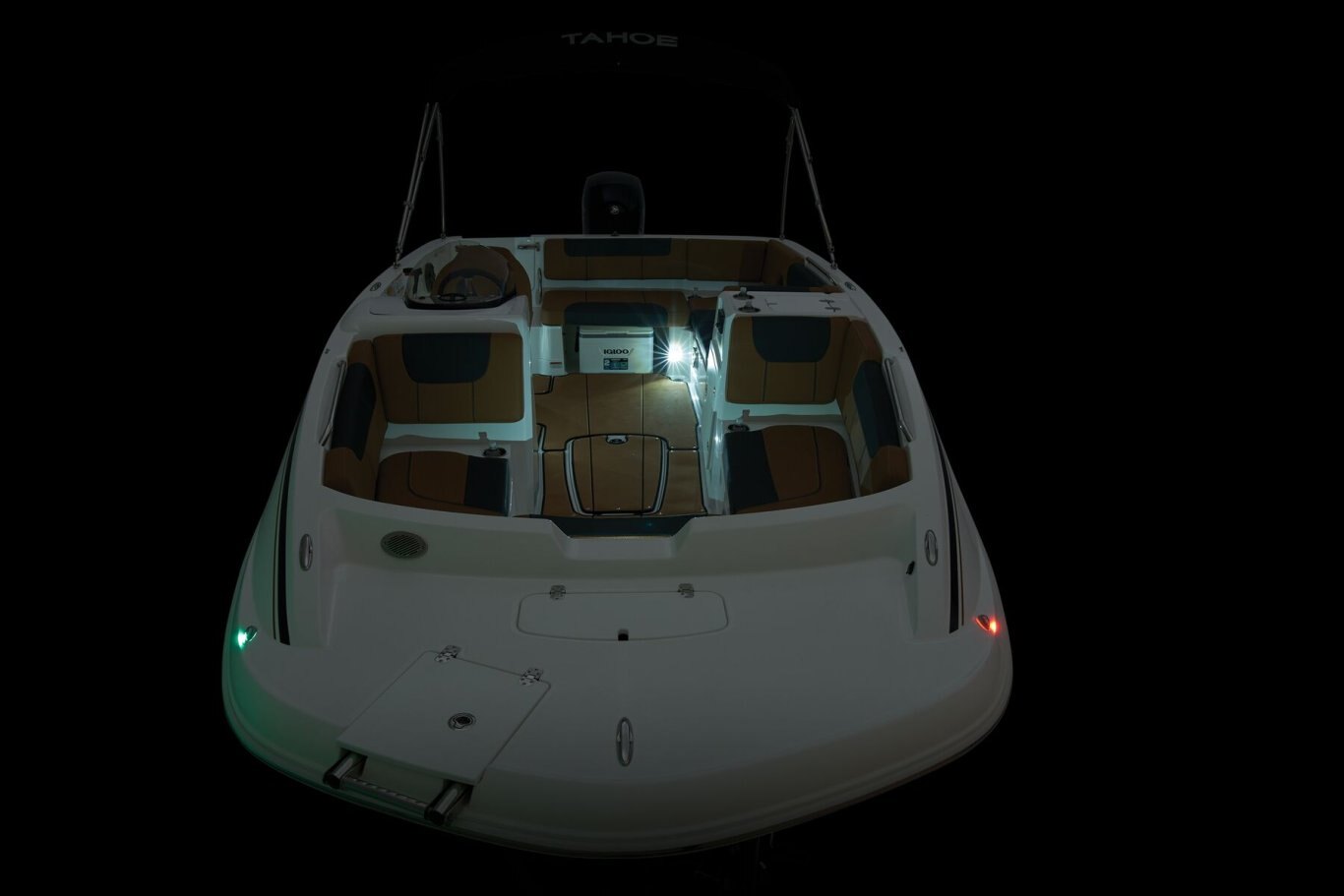 The helm boasts traditional gauges and switches for a more hands-on pilot experience. This TAHOE® is always ready to cast a line with its in-gunnel rod storage, standard 11.5-gal. livewell, and large swim platforms that can be upgraded with fishing seats. If the bites are slowing down, bring up the party playlist on the 4-speaker, Bluetooth®-compatible Kicker® stereo. After cooling off in the water, reboard with ease thanks to swim ladders at either end of the boat.