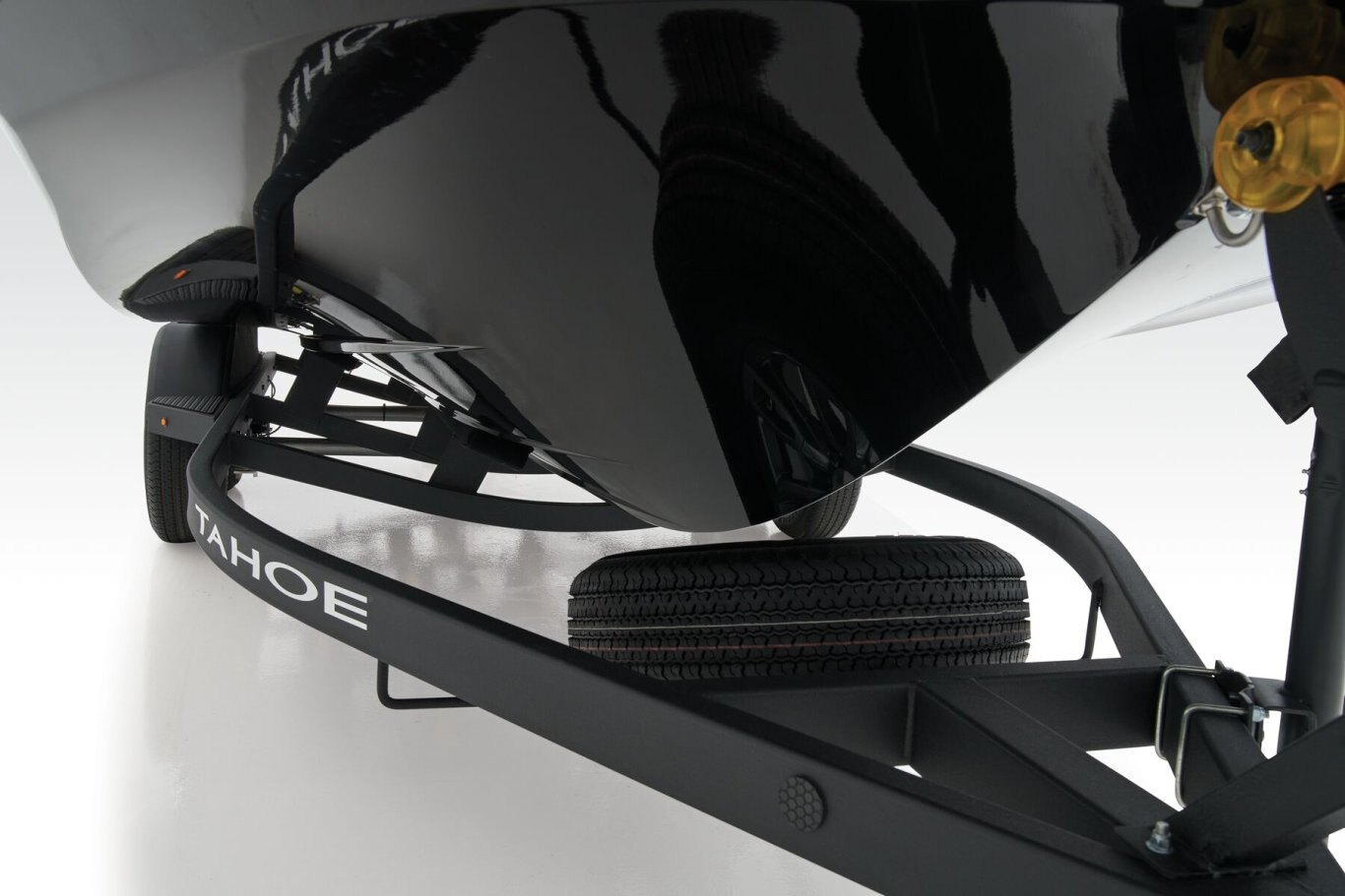 Custom-fit, tandem-axle trailer w/GALVASHIELD® Impact corrosion protection; 14" (35.56 cm) aluminum wheels w/radial tires & spare tire; & brakes on both axles — includes fold-away tongue jack; space-saving, swing-away tongue; heavy duty winch w/nylon strap & bow safety strap; safety cables; & LED submersible lights (additional freight charge applies for standalone trailer purchase)