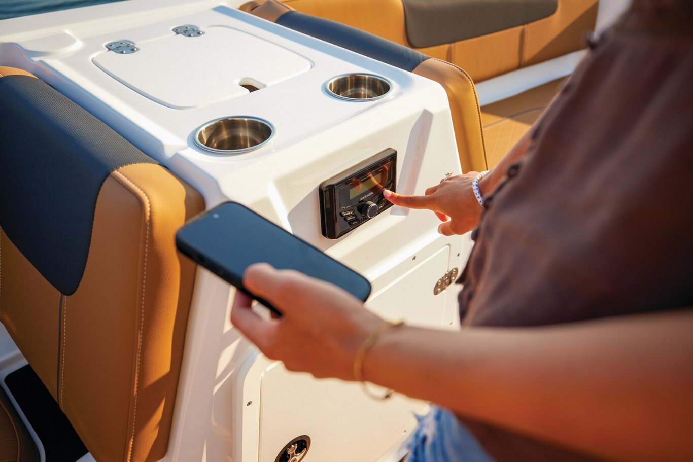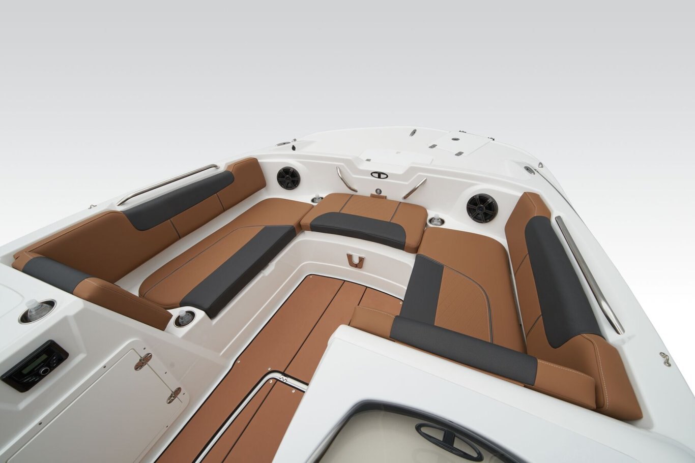 The ample lounges and benches hold a crew of 10. Stow gear, supplies, and more in the hidden storage compartments under the seats and elsewhere. Keep the drinks and snacks cold in the removable 25-qt. cooler. A standard bimini top helps you cool off when the sun is high. This model's removable aluminum ski-tow pylon and in-floor wakeboard/ski storage makes preparing for watersports a snap.