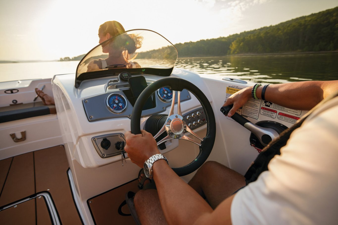 The 2026 TAHOE® 1950 comes standard with a 150hp Mercury® XL FourStroke outboard motor and has a recommended maximum 175hp rating.