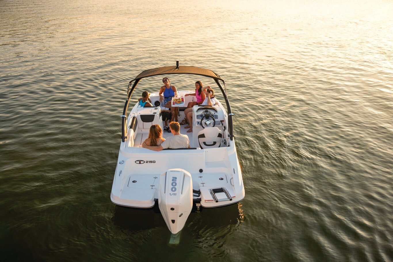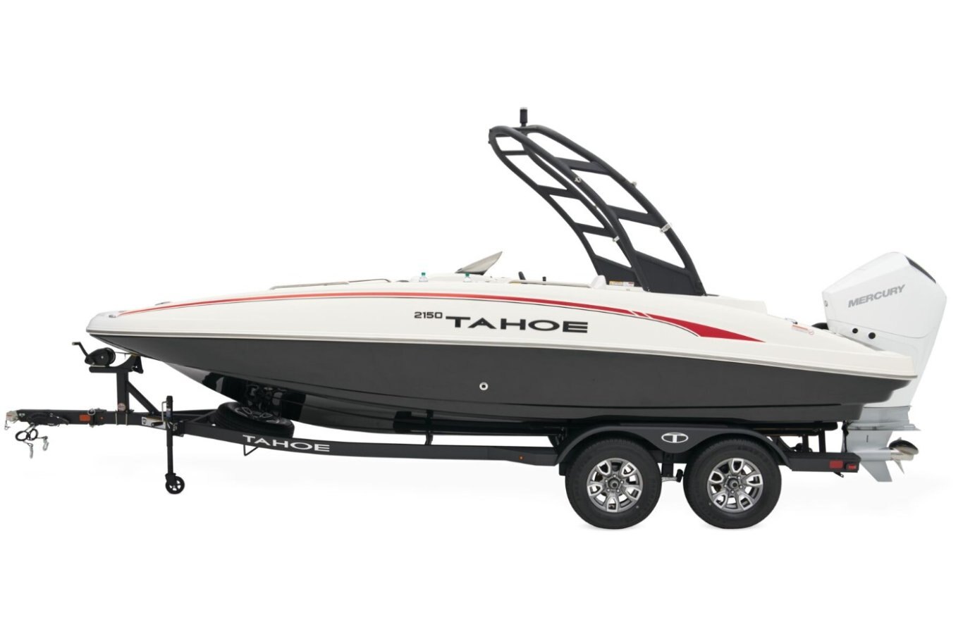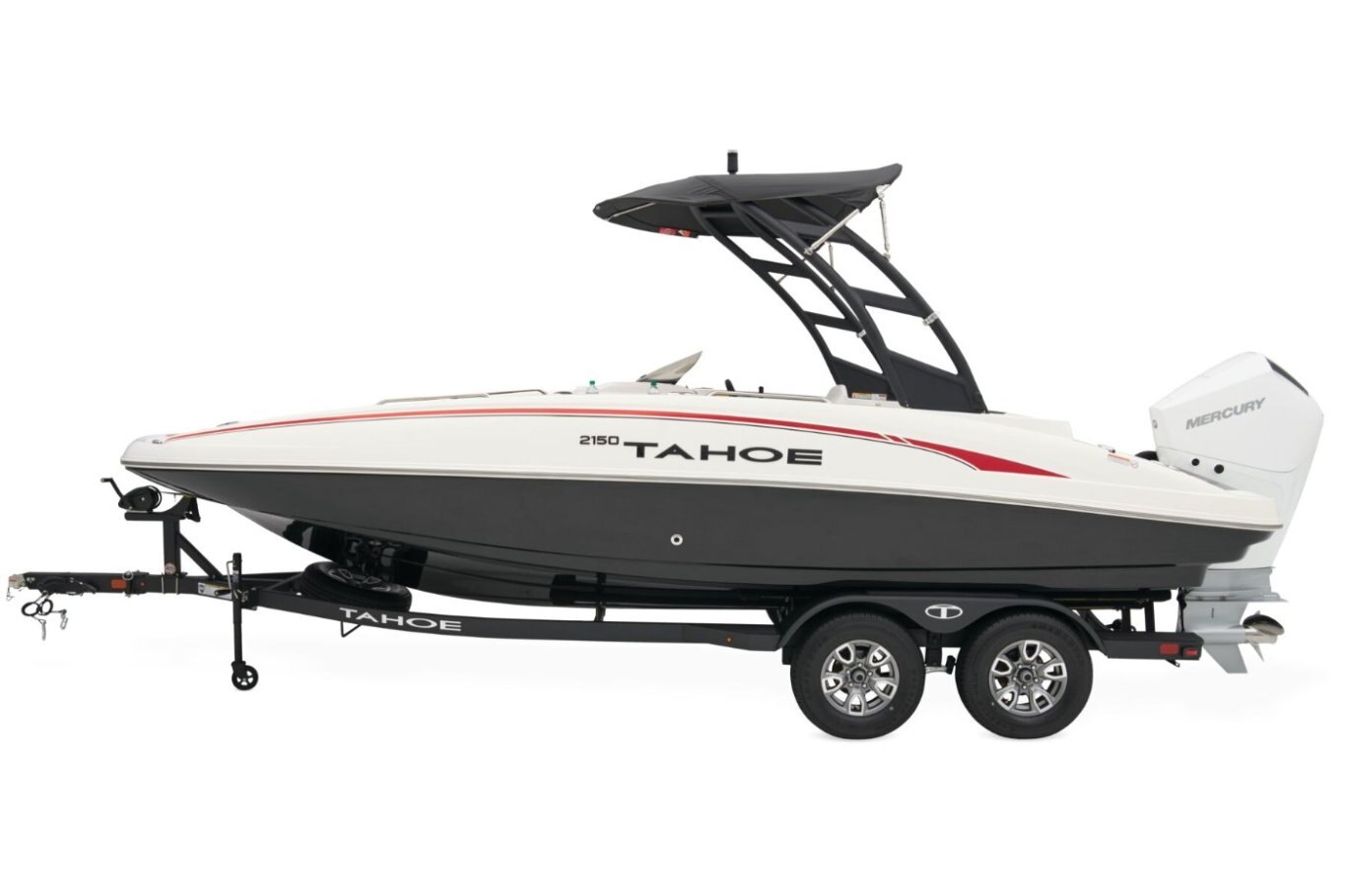 This TAHOE® can hold up to 11 passengers looking for days of fun on the water. Its open deck is built to serve anglers, sunbathers, and watersport enthusiasts alike. The wraparound bow lounge and L-shaped aft lounge sport hidden storage compartments to make the perfect living room on the water. The removable 36-qt. cooler and removable table are just icing on the cake! For the fishers, there's the 15-gal. aerated livewell with a pull-out sprayer and rod holders. An available fishing package adds a trolling motor, fish finder, and dual fishing seats. Thrill-seekers will love the in-floor wakeboard and ski storage compartment, standard removable ski-tow pylon, and 4-speaker Kicker® stereo with Bluetooth® compatibility. Pull up the bimini top and relax while the kids jump off the swim platform and get back on the boat using the aft or bow boarding ladders. The helm features traditional gauges and waterproof switches around a sport steering wheel. The 2026 TAHOE® 2150 comes standard with a 150hp Mercury® XL Pro XS® FourStroke outboard motor and has a recommended maximum 225hp rating. |