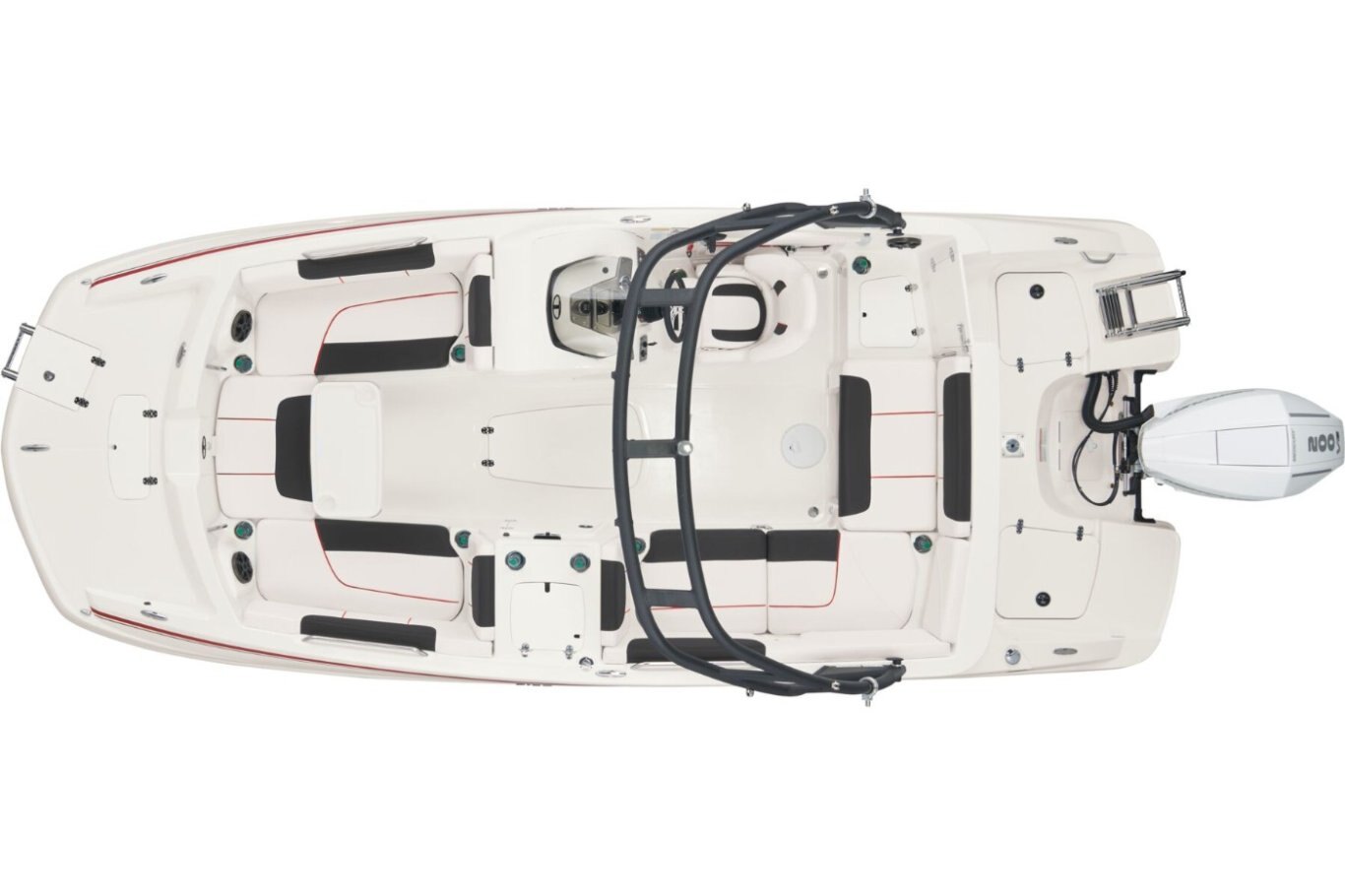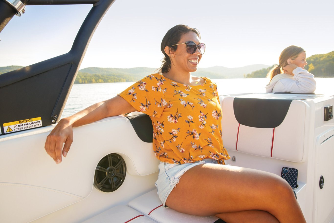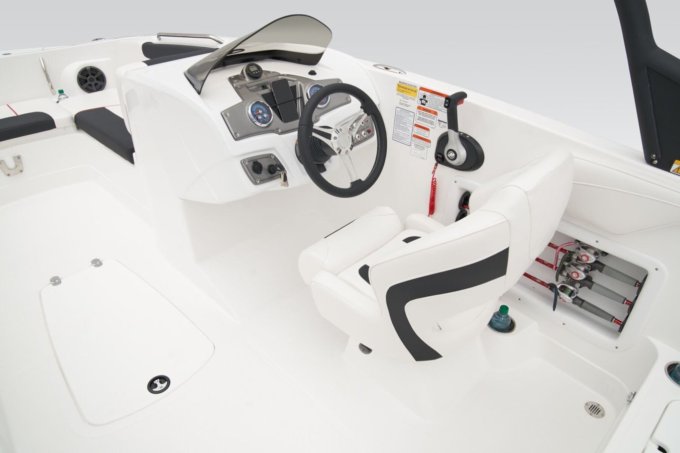 For the fishers, there's the 15-gal. aerated livewell with a pull-out sprayer and rod holders. An available fishing package adds a trolling motor, fish finder, and dual fishing seats. Thrill-seekers will love the in-floor wakeboard and ski storage compartment, standard removable ski-tow pylon, and 4-speaker Kicker® stereo with Bluetooth® compatibility. Pull up the bimini top and relax while the kids jump off the swim platform and get back on the