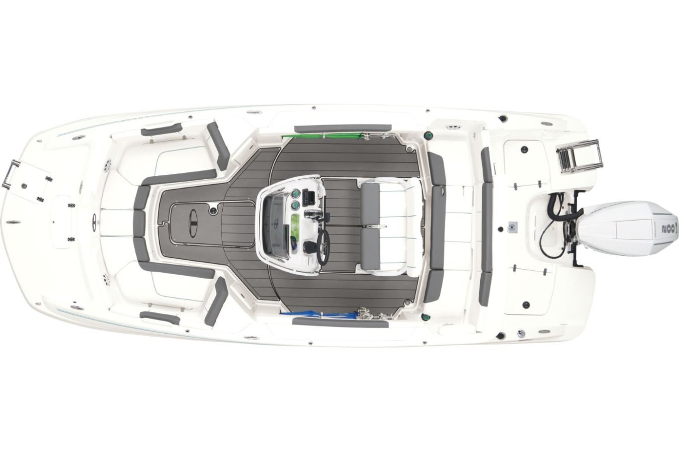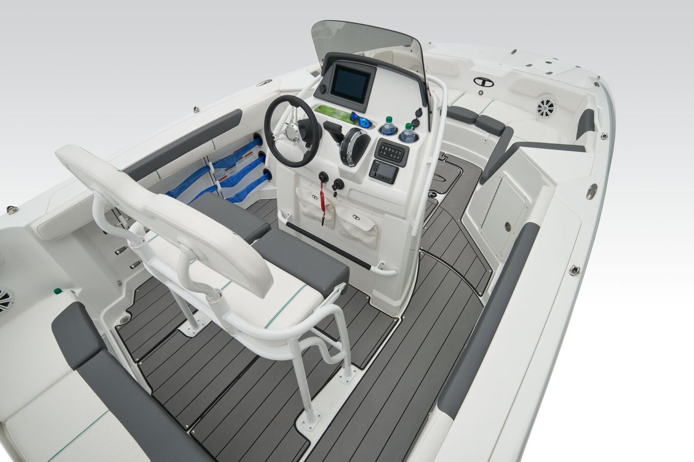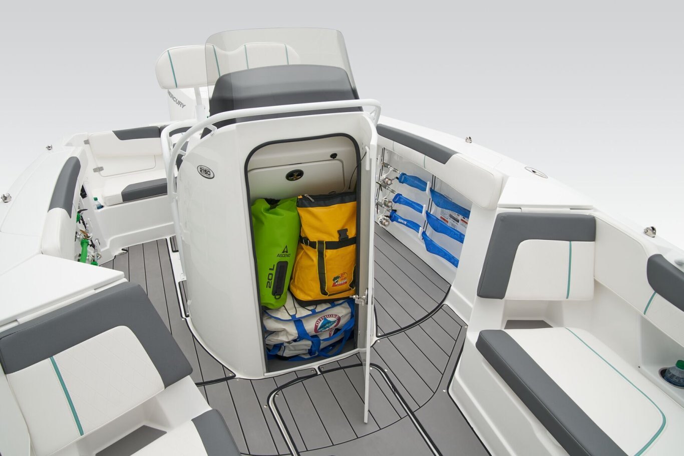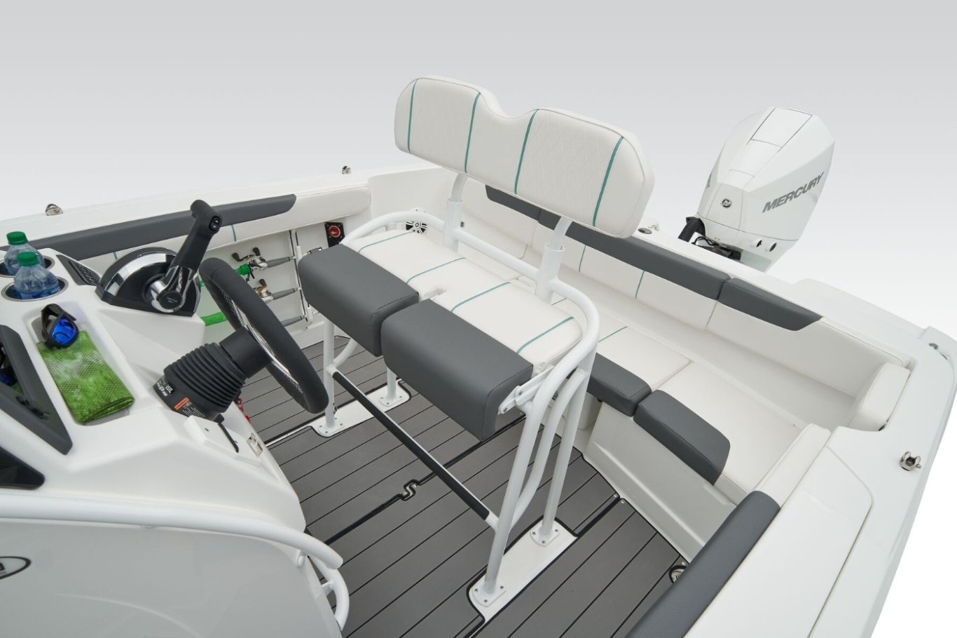 The unique center console design features an 8” digital display with a digital switch panel, powdercoated wraparound grabrail, removable storage pouches, phone holder, acrylic windscreen, interior storage and helm with hydraulic steering.