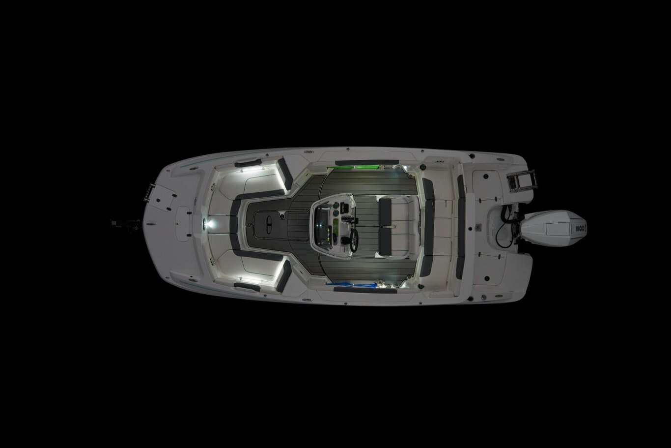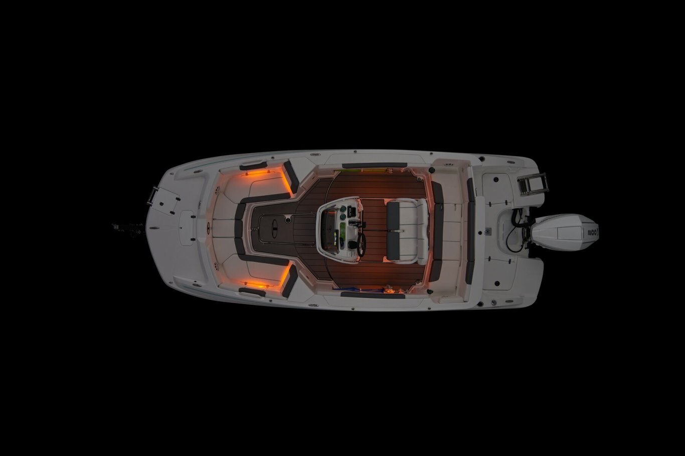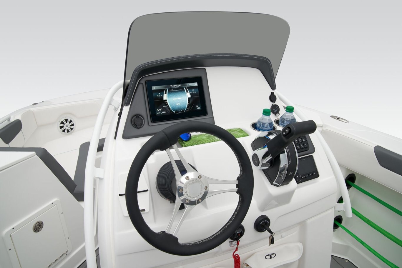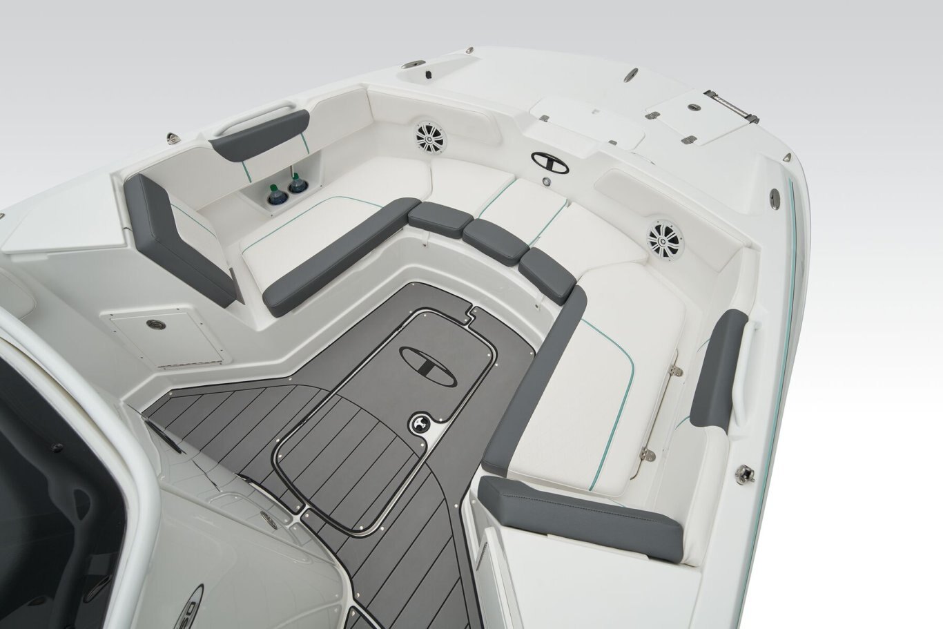 The unique center console design features an 8” digital display with a digital switch panel, powdercoated wraparound grabrail, removable storage pouches, phone holder, acrylic windscreen, interior storage and helm with hydraulic steering.
