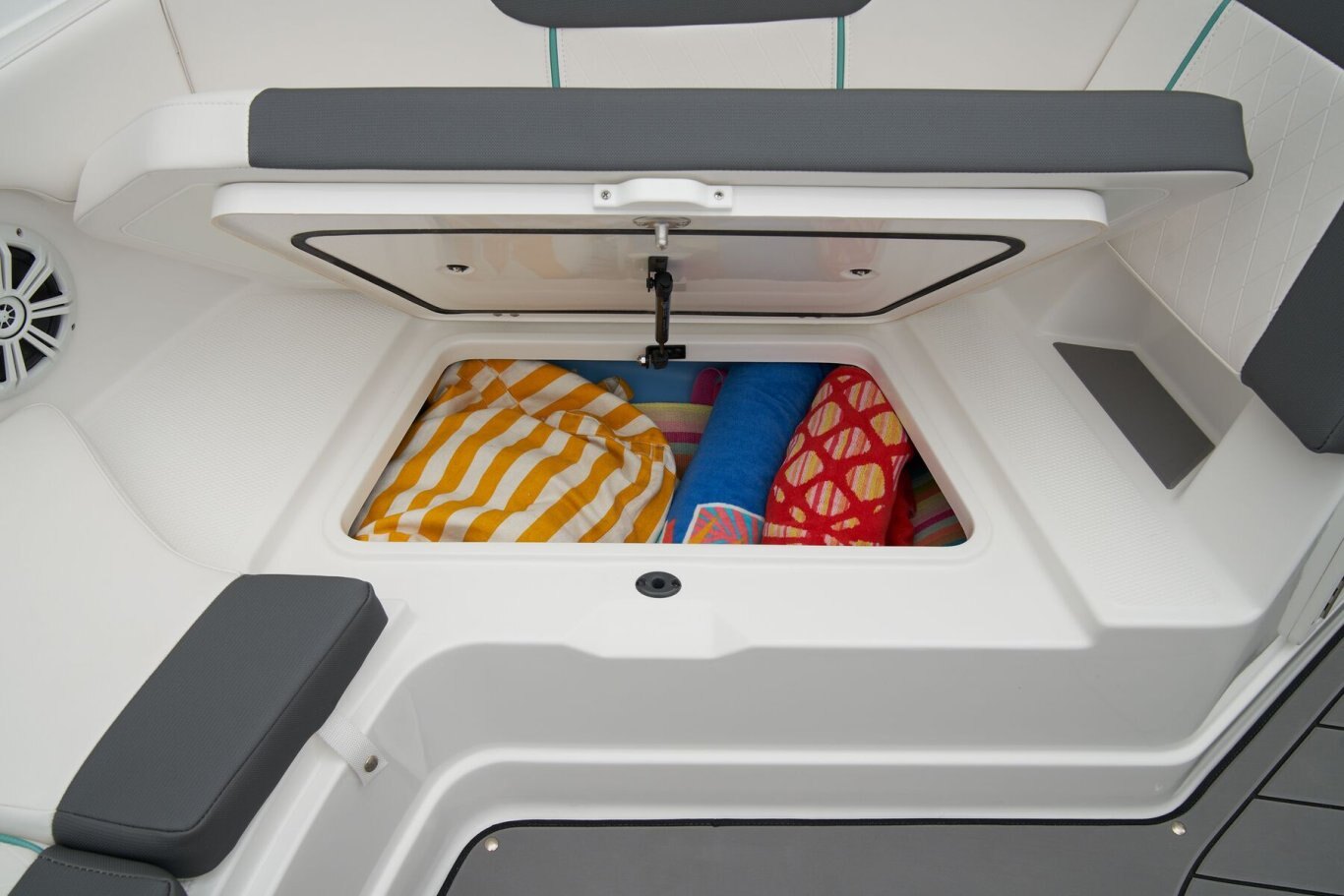 • In-floor wakeboard/ski/trolling motor storage compartment w/hold-open lid assist