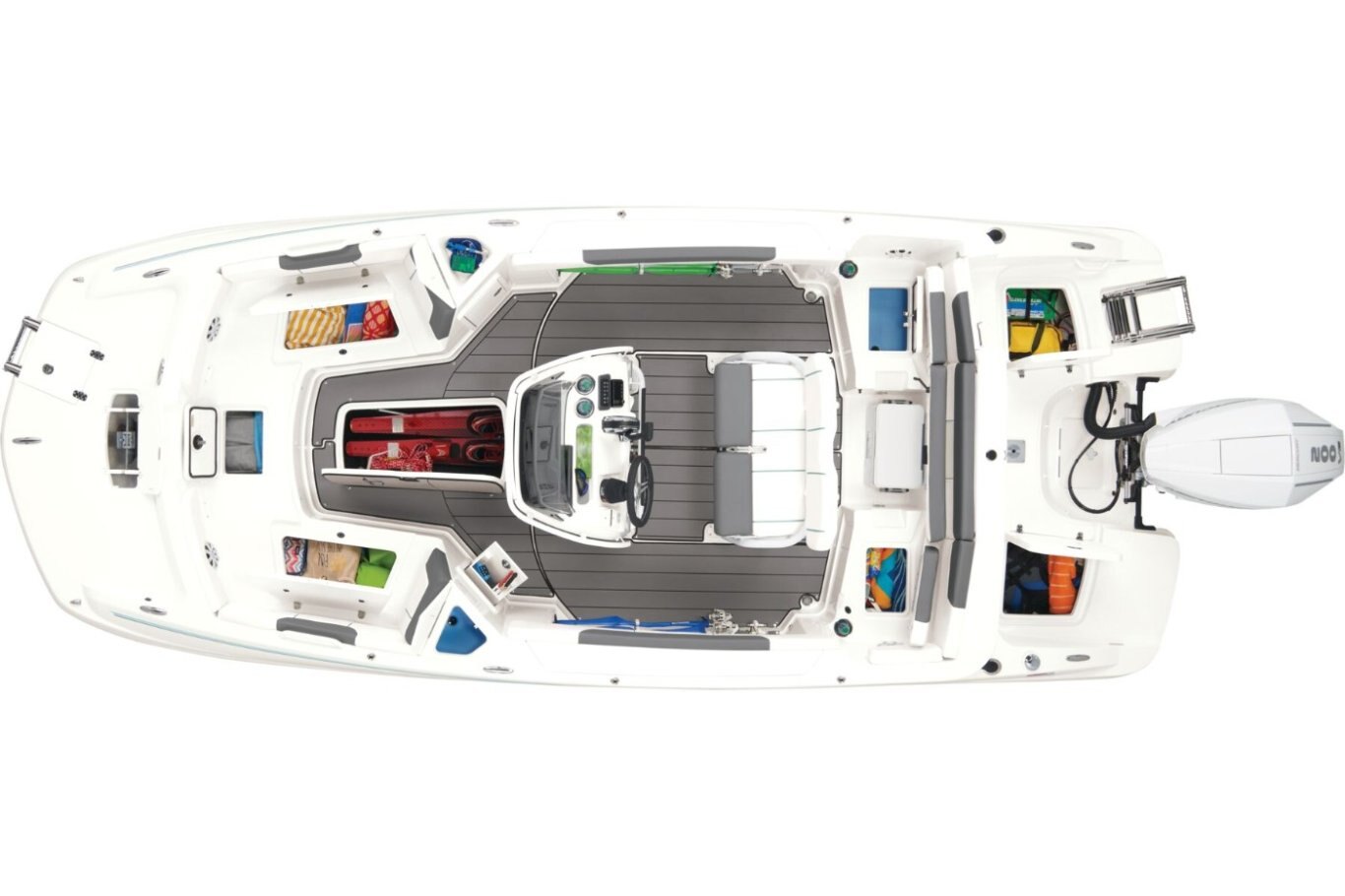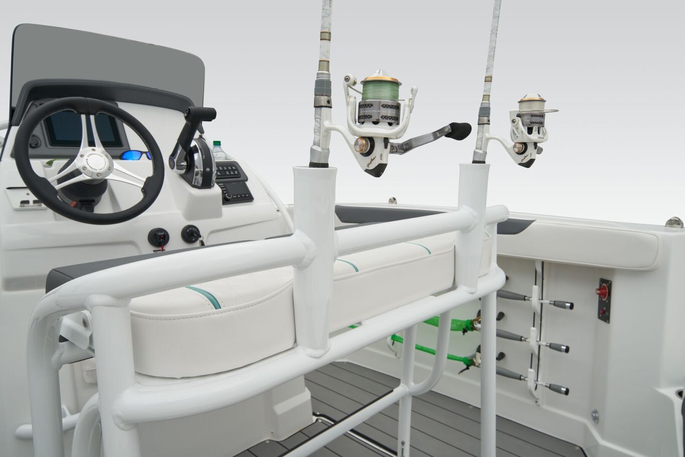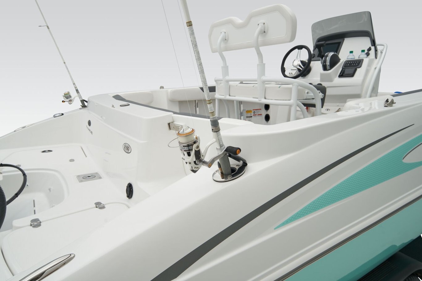 Its centralized helm boasts an 8" touch screen, a digital switch panel, and hydraulic steering. It's placed before a versatile leaning post with flip-up bolsters and a removable backrest that's hiding fishing rod holders. You'll also find under-gunnel rod holders that can carry up to 6 combos. Speaking of fishing, this boat has plenty to offer anglers, such as two 84-qt. insulated compartments for fish boxes and coolers, a 17-gal. aerated livewell, and an optional fishing package that adds plenty more exciting features.