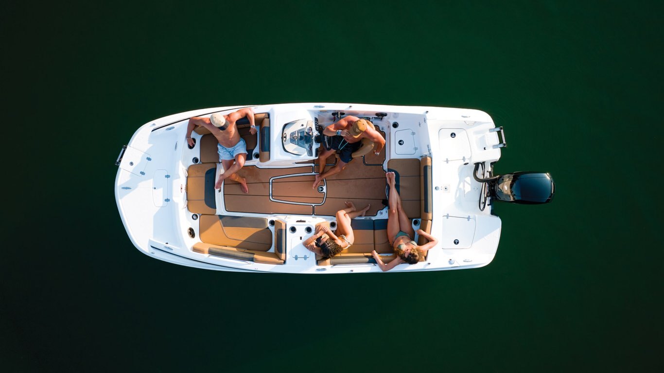 The ample lounges and benches hold a crew of 10. Stow gear, supplies, and more in the hidden storage compartments under the seats and elsewhere. Keep the drinks and snacks cold in the removable 25-qt. cooler. A standard bimini top helps you cool off when the sun is high. This model's removable aluminum ski-tow pylon and in-floor wakeboard/ski storage makes preparing for watersports a snap.