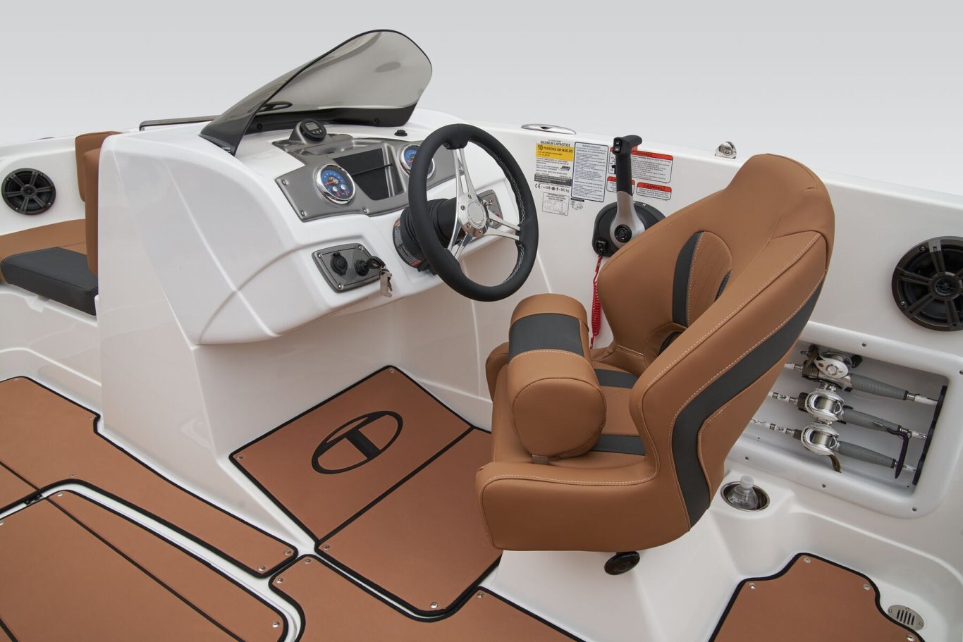 The helm boasts traditional gauges and switches for a more hands-on pilot experience. This TAHOE® is always ready to cast a line with its in-gunnel rod storage, standard 11.5-gal. livewell, and large swim platforms that can be upgraded with fishing seats. If the bites are slowing down, bring up the party playlist on the 4-speaker, Bluetooth®-compatible Kicker® stereo. After cooling off in the water, reboard with ease thanks to swim ladders at either end of the boat.