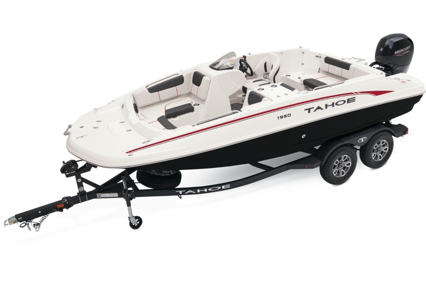 The 2026 TAHOE® 1950 comes standard with a 150hp Mercury® XL FourStroke outboard motor and has a recommended maximum 175hp rating.