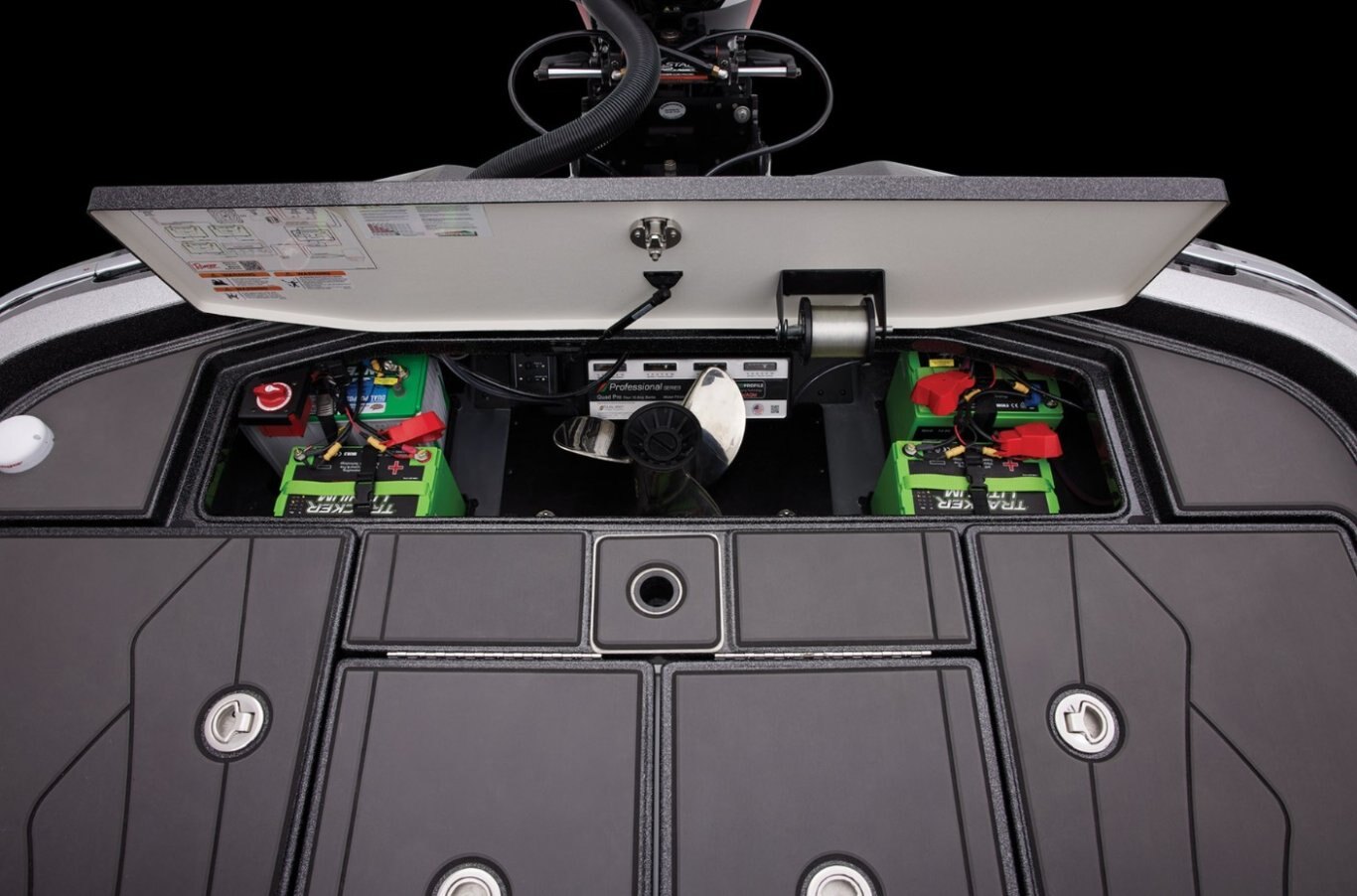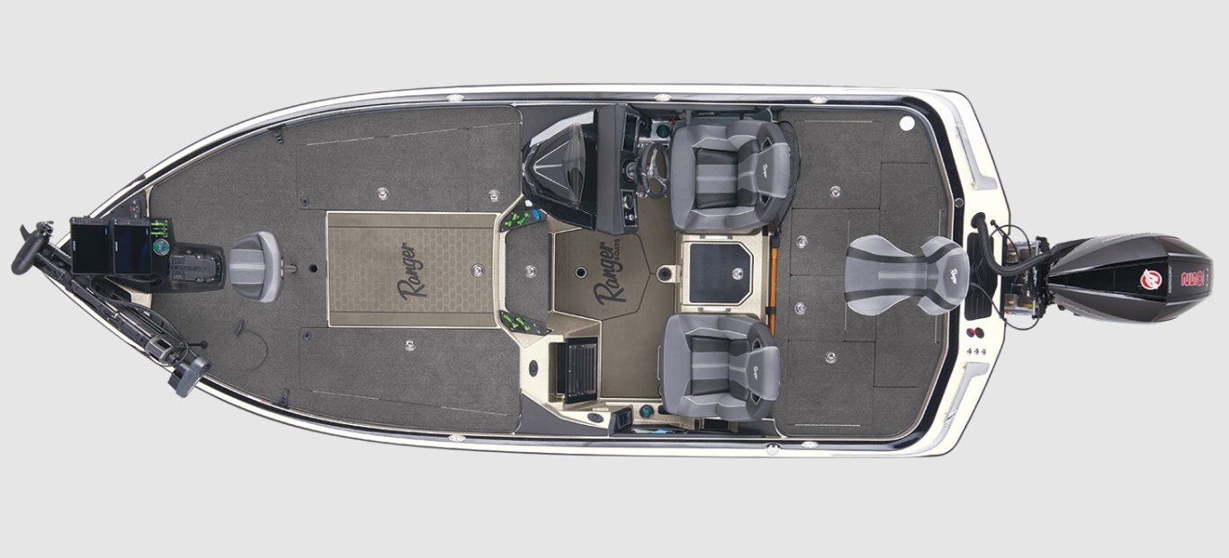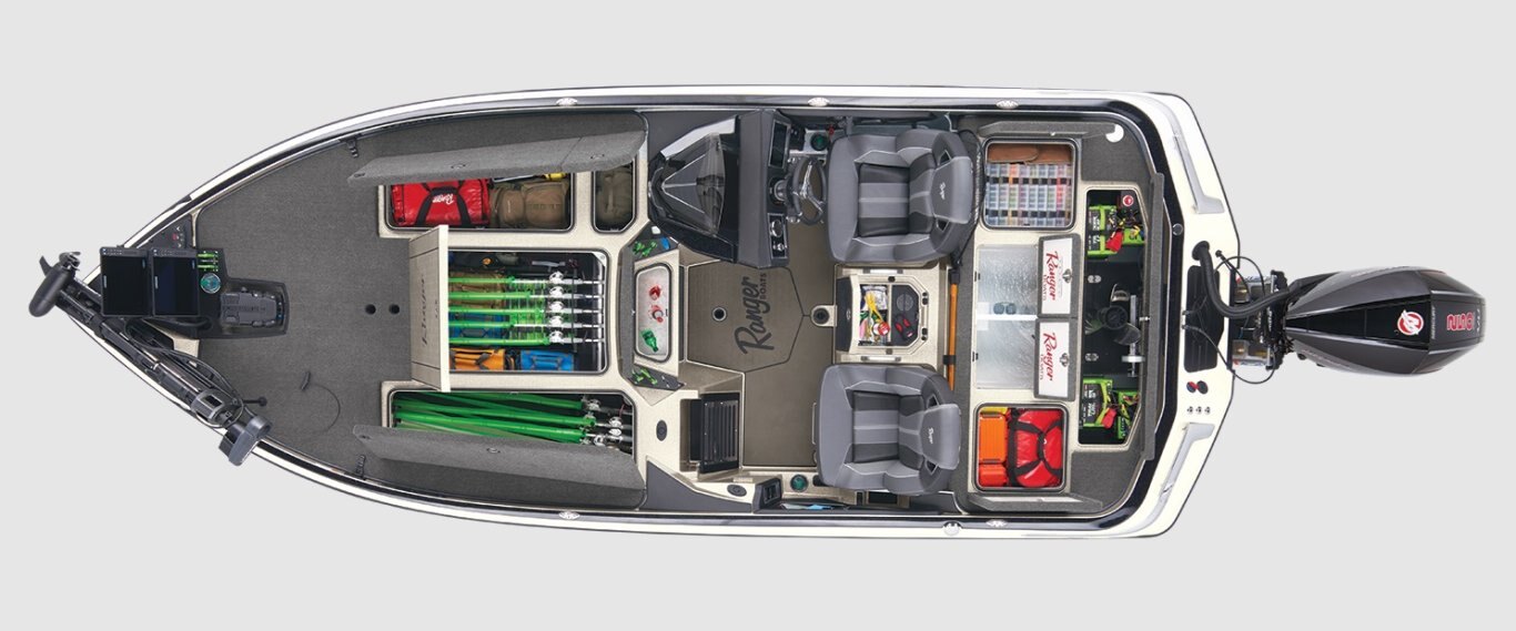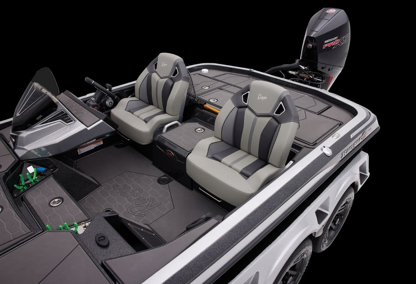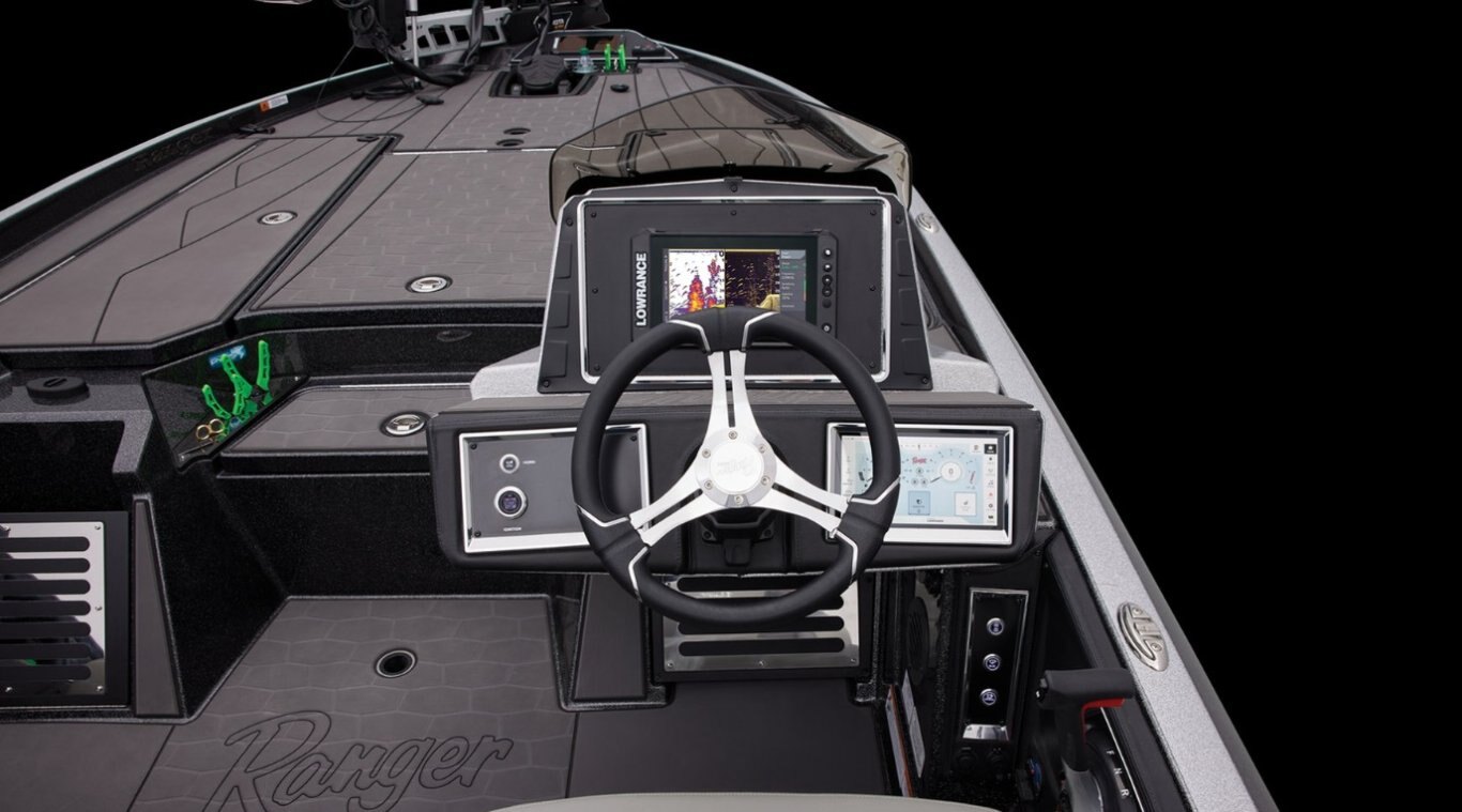 An all-new console carries dual graphs or a single 16” unit and the touchscreen Ranger R.I.D.E. system integrates total control over every boat and engine function. The all-new seats rest on easy-to-adjust slides and the color-matched fiberglass shellbacks take the aesthetic to a new level. A key fob and integrated push-to-start ignition let you start-up quicker and deliver greater security when you’re on the road. Inside the coin box is a wireless phone charger, and in the battery box are standard lithium batteries.