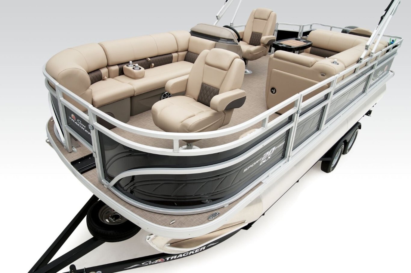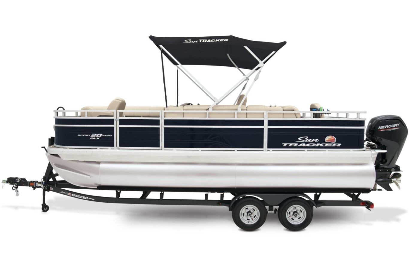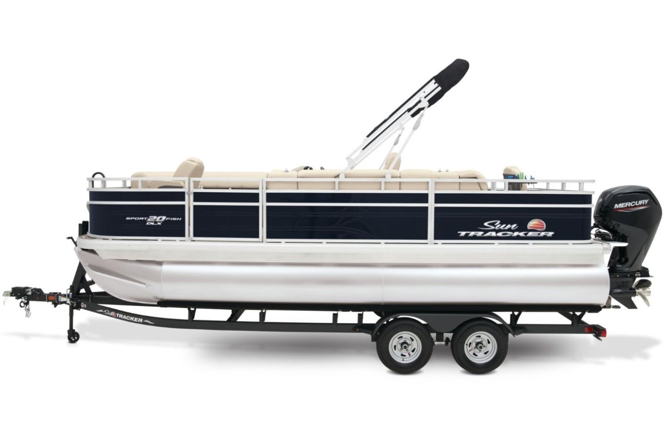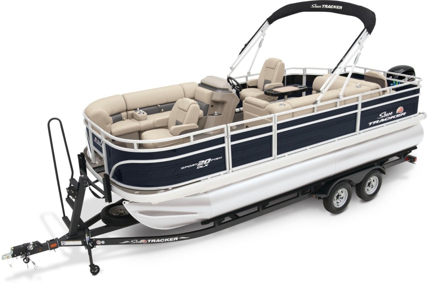 Get the best of 2 worlds with the 2025 SPORTFISH™ 20 DLX. This pontoon boat offers a space built for both serious fishing trips and days of fun on the water for up to 10 friends and family. Spend the day casting lines from the fore fishing captain's chair or the comfortable aft folding chair. These fishing stations feature an aft aerated livewell, drink holders, and rod holders. Navigate to the next fishing spot in the helm's captain's chair and the ergonomic console with a SUN TRACKER FLARE touchscreen, built-in storage space, and soft-touch steering wheel. Between fishing sessions, relax on the 2 lounges that also feature the STOW MORE™ system, which puts storage spaces under the seats and behind the seat backs. The 9' QuickLift® bimini top and Wet Sounds® stereo with Bluetooth® and 2 upholstery speakers let you create the perfect hangout space on the water. Access the deck via 1 of the 3 inward-swinging gates. After cannonballing into the lake, you can return easily using the aft reboarding platform's telescoping ladder. The SPORTFISH™ 20 DLX comes standard with a 60hp Mercury® ELPT FourStroke outboard motor and has a recommended maximum 90hp rating. |