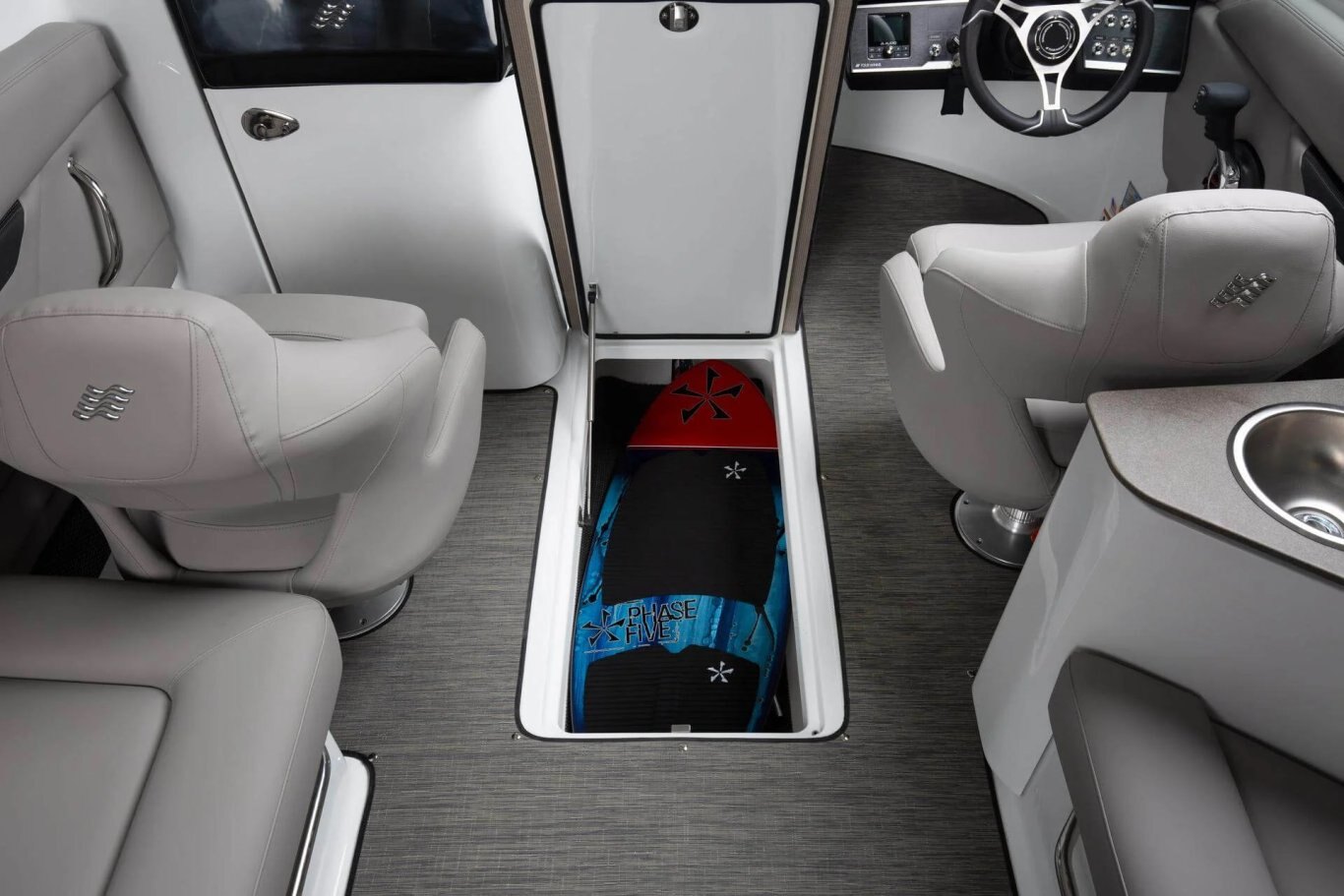 - Ski locker, in-floor, w/ gas-assist hinged lid & mat