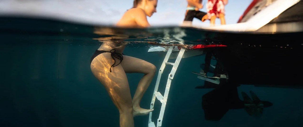 - Ladder, stern, angled, deep-reach, hidden w/ wide steps