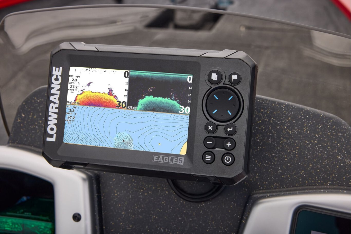 • NEW bow Lowrance® Eagle 5 swivel color fishfinder + GPS w/CHIRP & SplitShot™ transducer