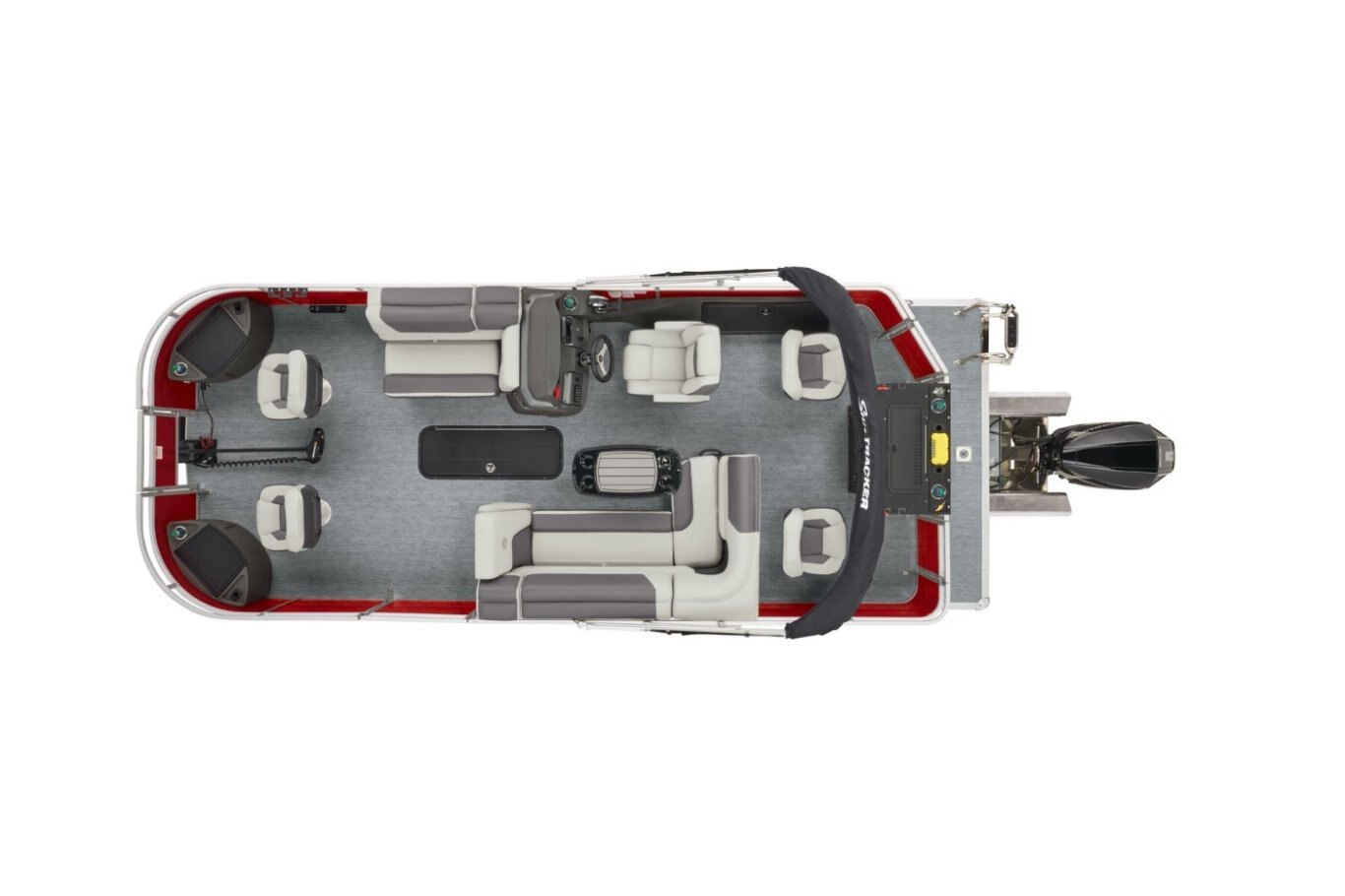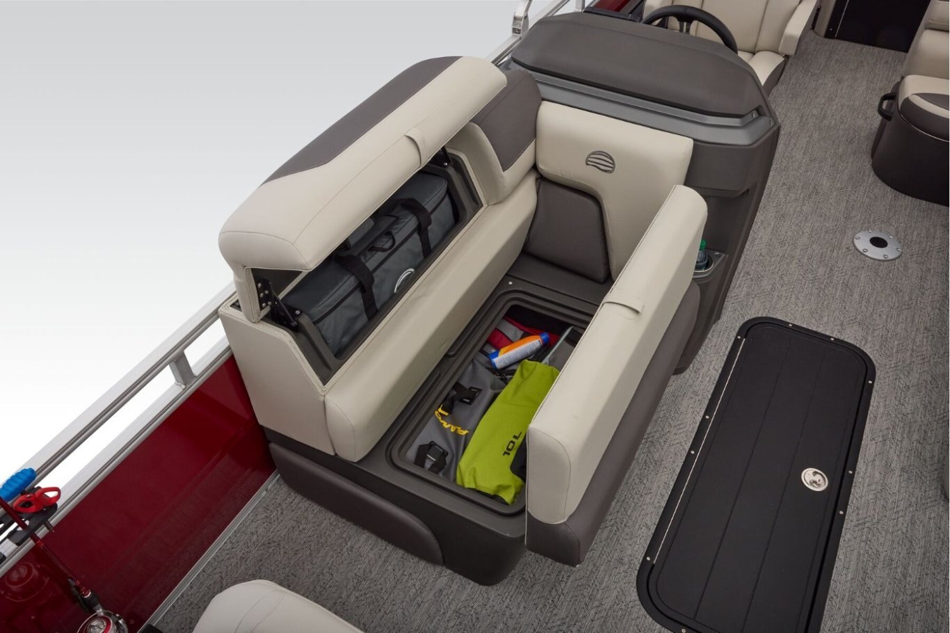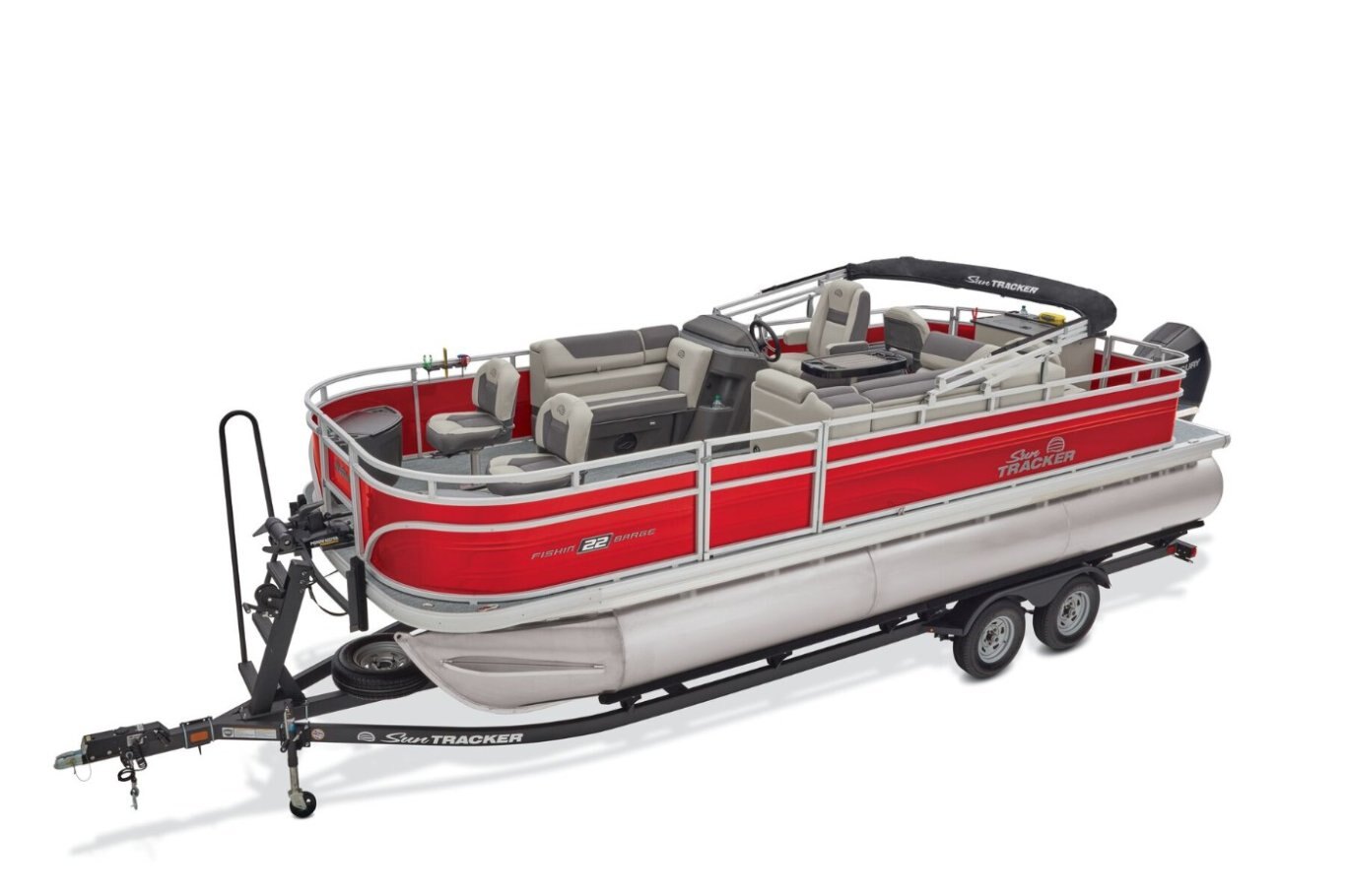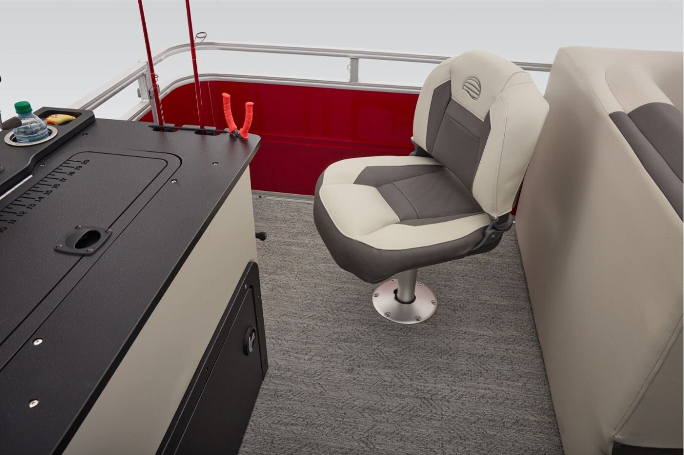 Captains can control it all with the SUN TRACKER FLARE™ touch-screen gauge display. Set up the 10' bimini top, grab your rod out of the lockable rod box, and post up in one of the two fishing decks—each of which sports a 16-gal. aerated livewell—and two swiveling fishing chairs next to rod and tool holders. The dual lounges or aft bench with hidden storage are ready for relaxation. The lounges’ all-new open section in the backrest increases accessible storage and even has extra cupholders. 2026 also brings a wider, ergonomic boarding ladder. The FISHIN' BARGE 22 XP3 is the most equipped fishing pontoon in the SUN TRACKER lineup. If you're looking for the best, you've found it. |