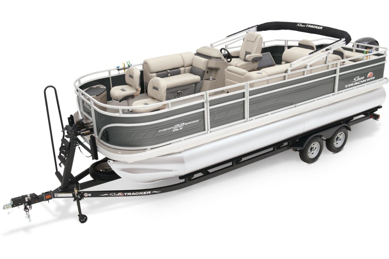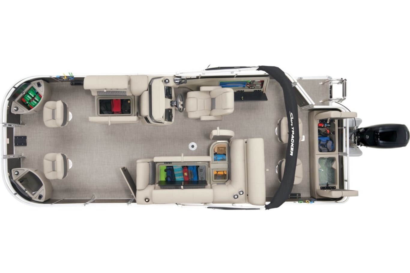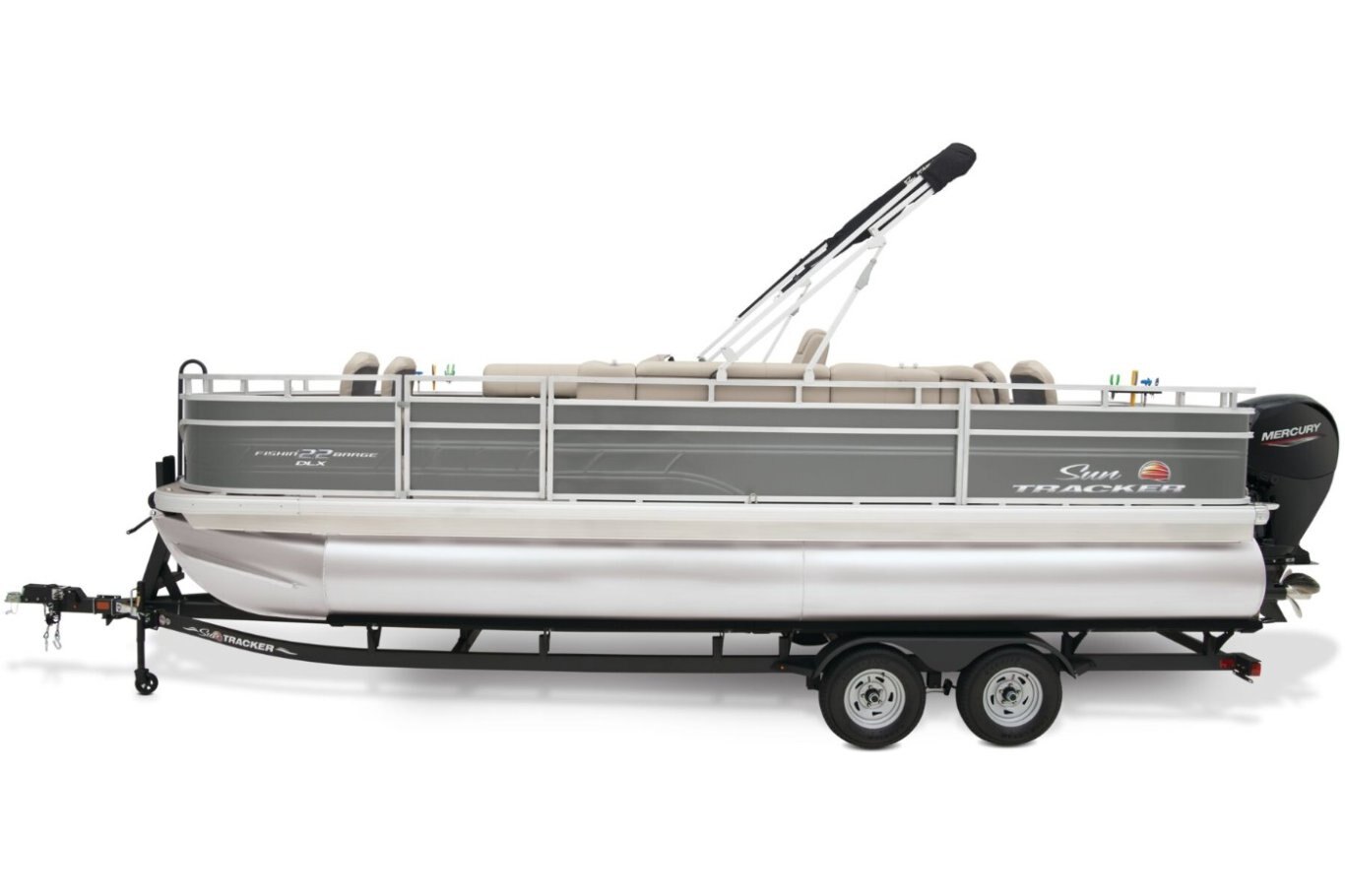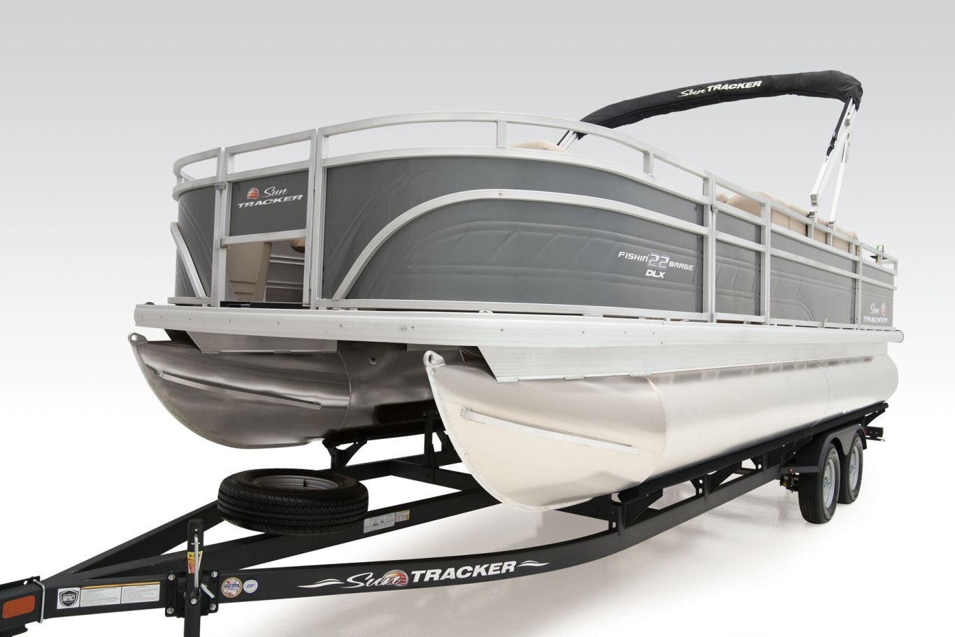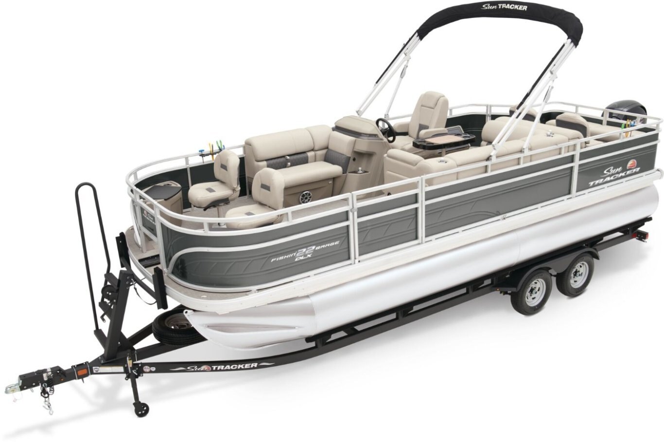 The 2025 FISHIN' BARGE® 22 DLX has a lot to offer to crews as large as 11 people who are looking to get some fishing done or just have some fun on the water! Anglers will never want to leave this fishing pontoon boat's deck. And with fore and aft fishing decks featuring 32 gal. of capacity between 2 livewells, 4 removable and foldable fishing chairs, and a 10' QuickLift® bimini top to stay cool under, there's no reason to leave! But if you have to, the lockable rod compartment lets you rest easy until your next fishing trip. The large mid-deck couch and L-shaped lounge, as well as the aft seats, all feature the STOW MORE™ system. This storage solution allow you to pack fishing gear, snacks, safety equipment, and more under the seat cushions and behind the seat backs. If anyone wants to take a dip in the water, they can simply open 1 of the 3 inward-swinging doors and dive in! The aft reboarding platform has a 4-rung telescoping ladder for easy reentry. The FISHIN' BARGE® 22 DLX comes standard with a 115hp Mercury® ELPT FourStroke outboard motor and has a recommended maximum 150hp rating. |
