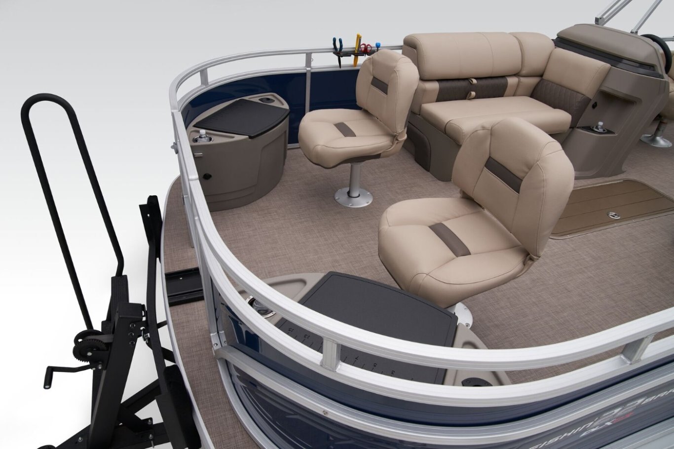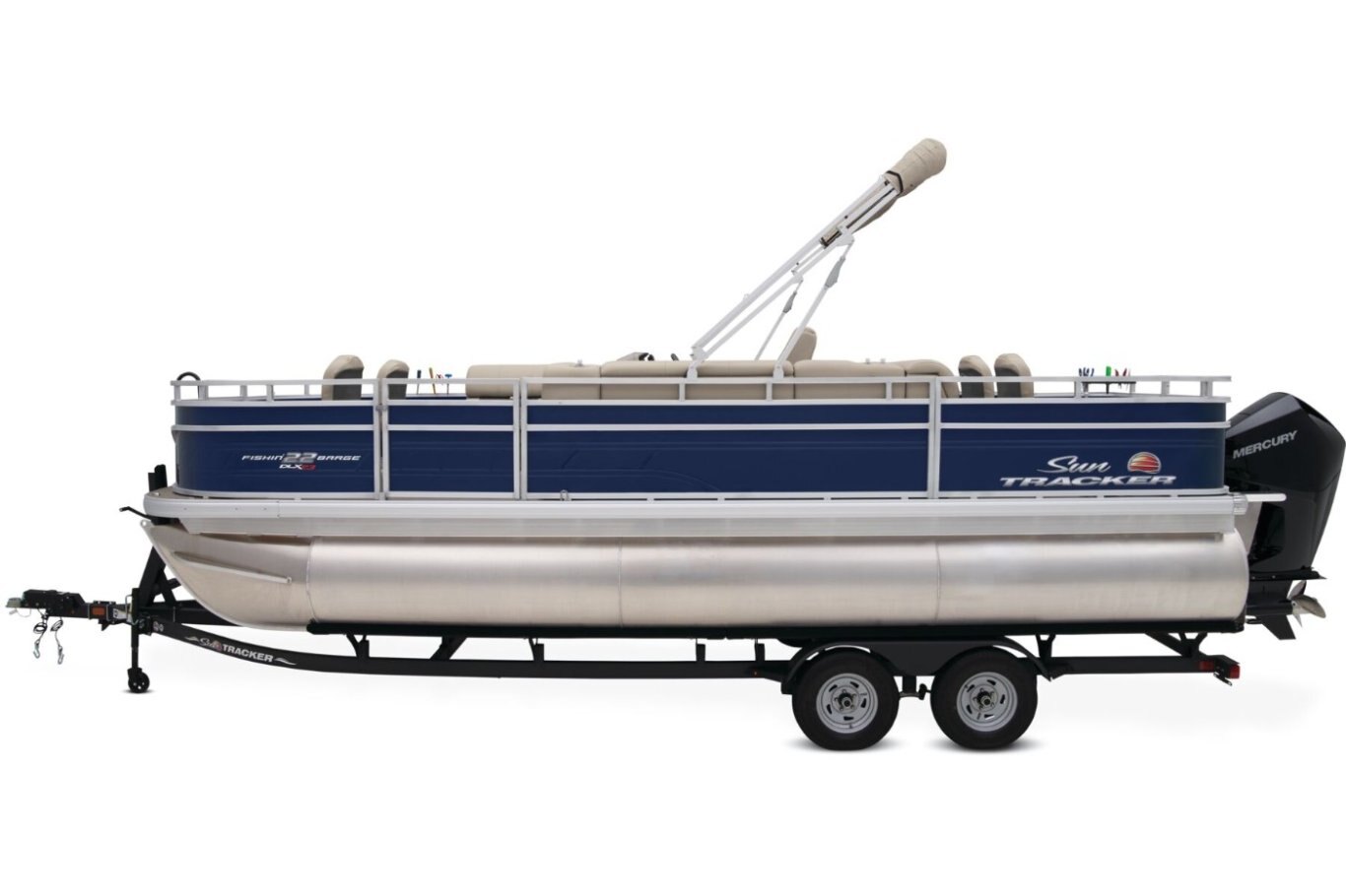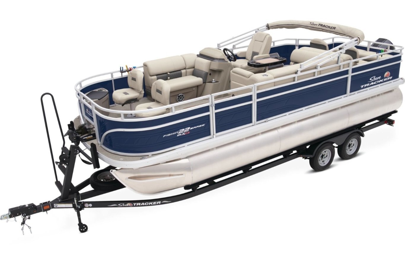 The apex of angler-focused pontoons is here! Introducing the 2025 FISHIN' BARGE® 22 XP3 tritoon boat, your new floating fishing headquarters. This SUN TRACKER® pontoon boat holds 11 passengers on its spacious 22' deck. Anglers, find your stations in the fore and aft casting decks. Those casting decks boast 4 removable and folding chairs with heavy-duty pedestals, rail-mounted rod and tool holders, aerated livewells, a lockable rod-storage compartment, drink holders—the list of features you'll enjoy during your fishing trips goes on. When the rods are down, relax in the L-shaped port lounge or the starboard couch. At the helm, you'll find a swiveling captain's chair and a console with a storage space, drink holders, and ergonomically positioned controls. That's where you'll also find the Wet Sounds® stereo with Bluetooth® compatibility that plays through 2 upholstery speakers. Other features to get excited about include the 10' QuickLift® bimini top and the STOW MORE™ system that hides storage spaces in the seats. This pontoon sports three 26"-dia. multichambered logs that improve stability, giving you a steady surface for casting. The FISHIN' BARGE® 22 XP3 comes standard with a 150hp Mercury® L FourStroke outboard motor and has a recommended maximum 200hp rating. |