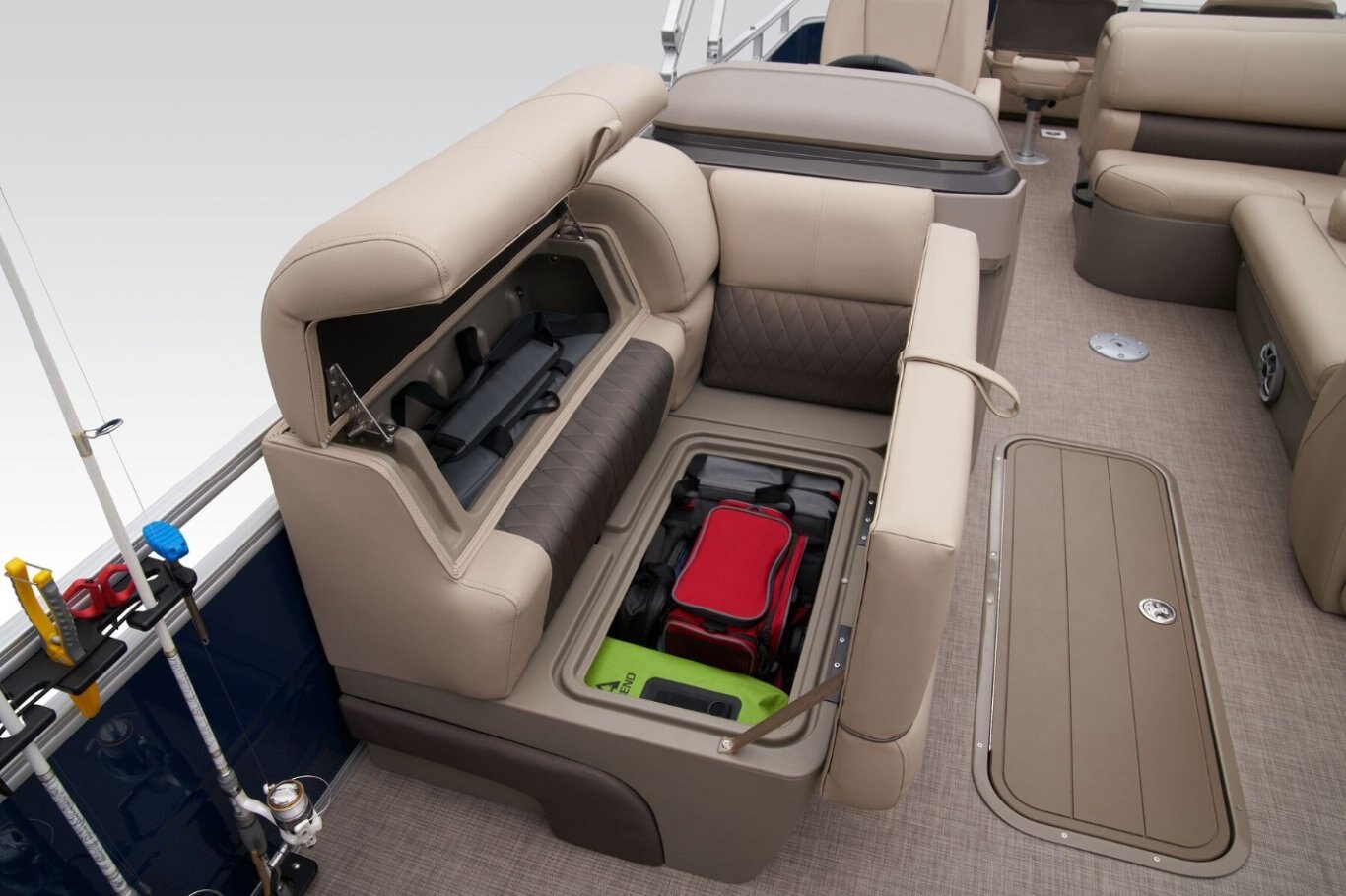 Rod storage In addition to vertical rod holders throughout, you can stow gear in the 7' 6" starboard locker. |