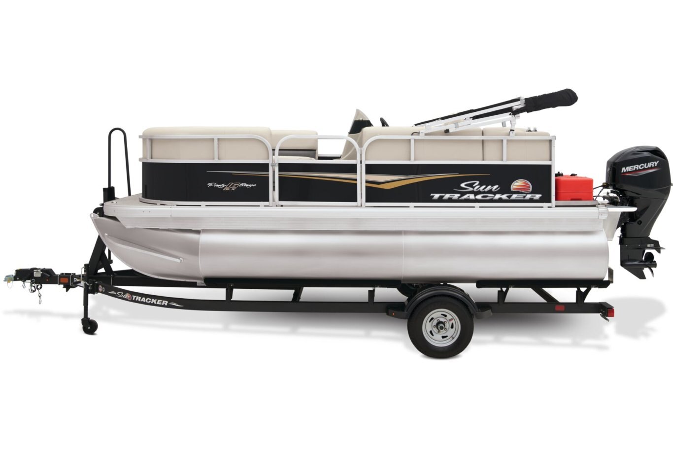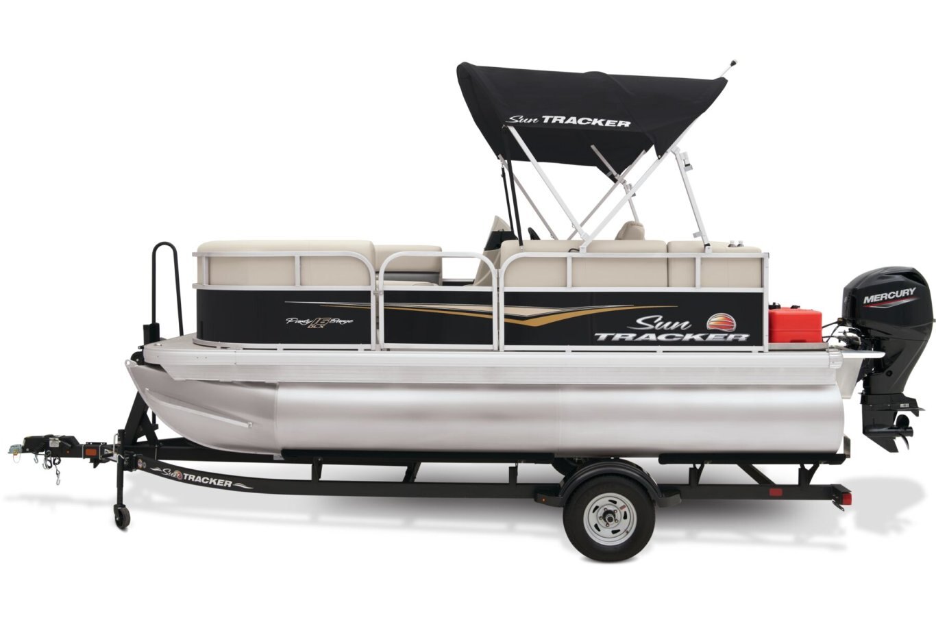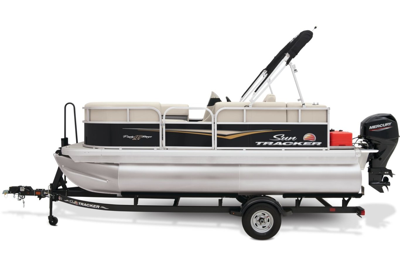 Cruise into the lake life with the 2025 SUN TRACKER® PARTY BARGE® 16 DLX. The most compact pontoon boat in the SUN TRACKER® family makes towing a breeze. Its deck has plenty of room for a crew of 7 friends and family. Let them kick back on the 3 luxurious corner lounges while the pilot sits at the helm in the swiveling captain’s chair. Each seat is wrapped in luxurious and durable vinyl. The wraparound fence sports a port wheelchair-accessible gate. You’ll also find gates at the fore and rear boarding platforms. Stash rods and reels, water toys for the kids, and other gear in the lounges’ hidden under-seat storage areas. Bring the party to life with the standard Bluetooth®-compatible Wet Sounds® stereo. When the sun’s beating down, stay cool in the shade of the 7’ bimini top. The captain can stand or sit proudly at the fiberglass-reinforced console equipped with a sport steering wheel and Mercury® binnacle control box. A storage space below the console holds extra snacks and supplies. The PARTY BARGE® 16 DLX comes standard with a 20hp Mercury® ELPT FourStroke outboard motor and has a recommended maximum 50hp rating. |