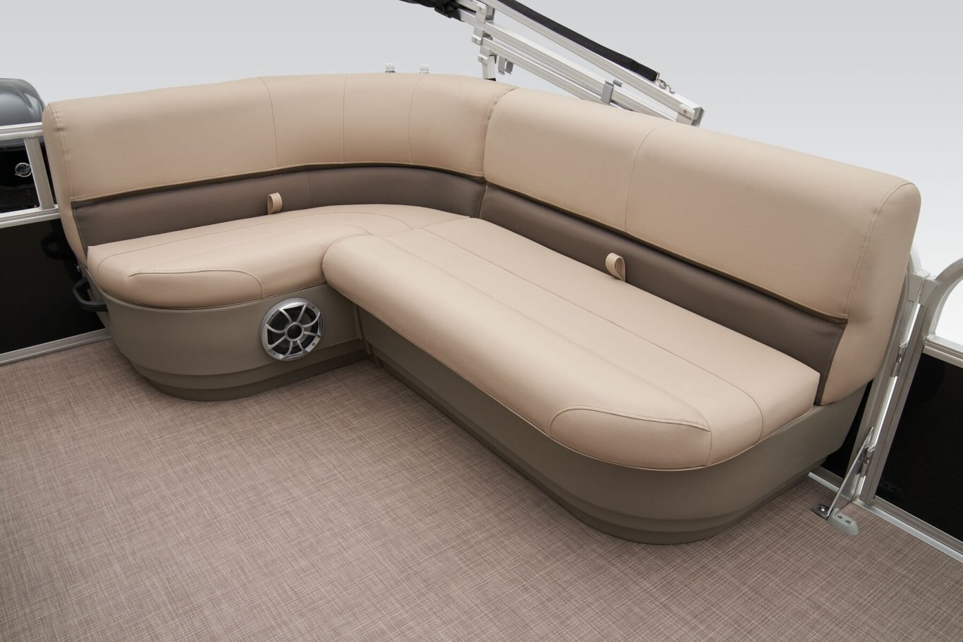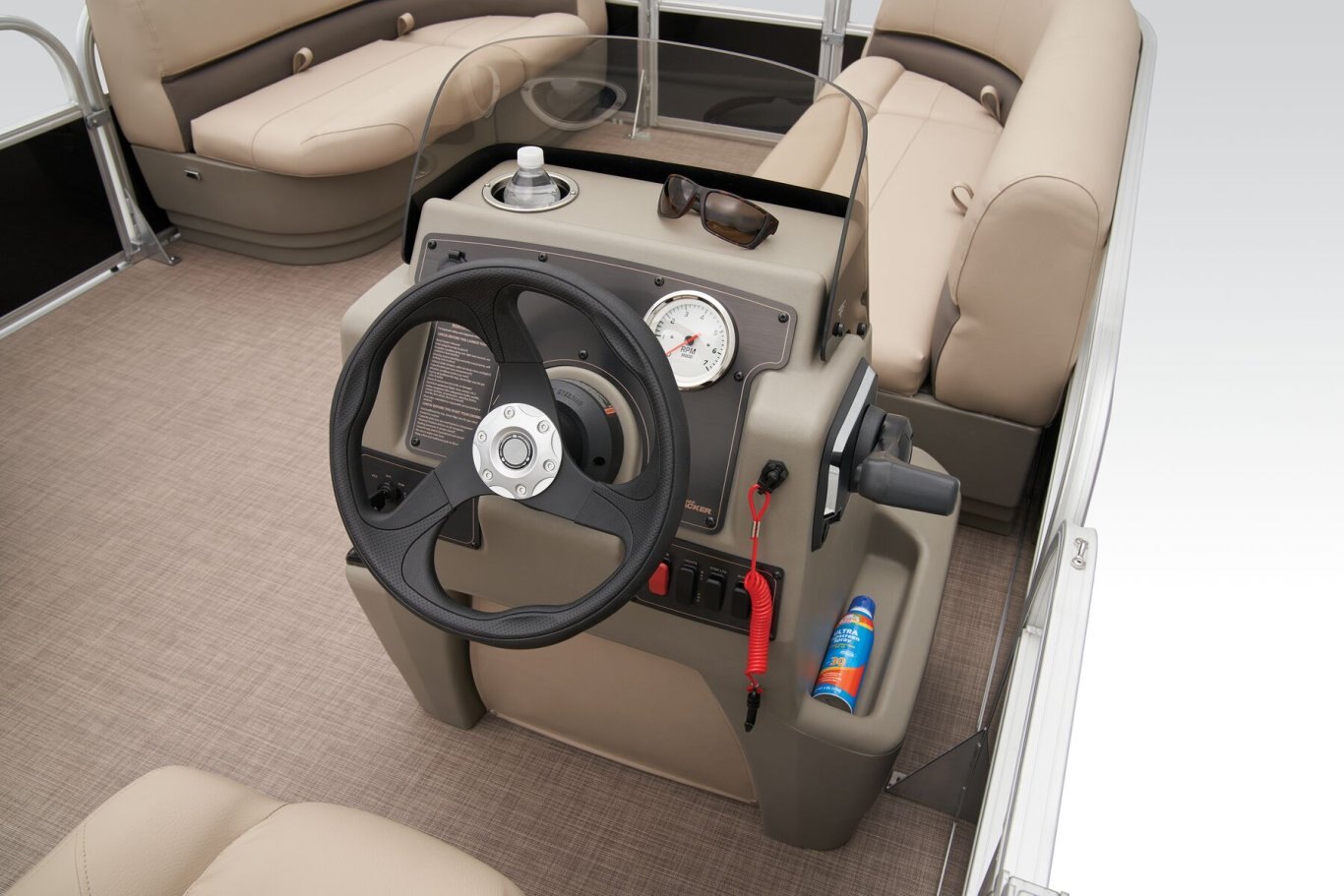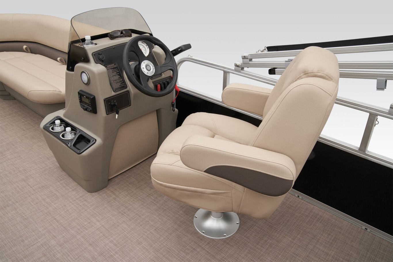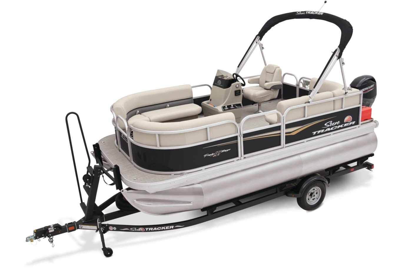Cruise into the lake life with the 2025 SUN TRACKER® PARTY BARGE® 16 DLX. The most compact pontoon boat in the SUN TRACKER® family makes towing a breeze. Its deck has plenty of room for a crew of 7 friends and family. Let them kick back on the 3 luxurious corner lounges while the pilot sits at the helm in the swiveling captain’s chair. Each seat is wrapped in luxurious and durable vinyl. The wraparound fence sports a port wheelchair-accessible gate. You’ll also find gates at the fore and rear boarding platforms. Stash rods and reels, water toys for the kids, and other gear in the lounges’ hidden under-seat storage areas. Bring the party to life with the standard Bluetooth®-compatible Wet Sounds® stereo. When the sun’s beating down, stay cool in the shade of the 7’ bimini top. The captain can stand or sit proudly at the fiberglass-reinforced console equipped with a sport steering wheel and Mercury® binnacle control box. A storage space below the console holds extra snacks and supplies. The PARTY BARGE® 16 DLX comes standard with a 20hp Mercury® ELPT FourStroke outboard motor and has a recommended maximum 50hp rating. |