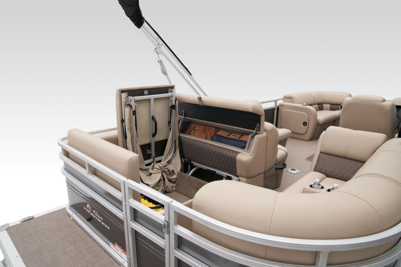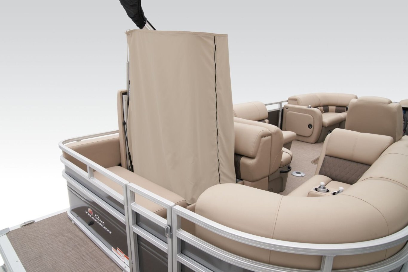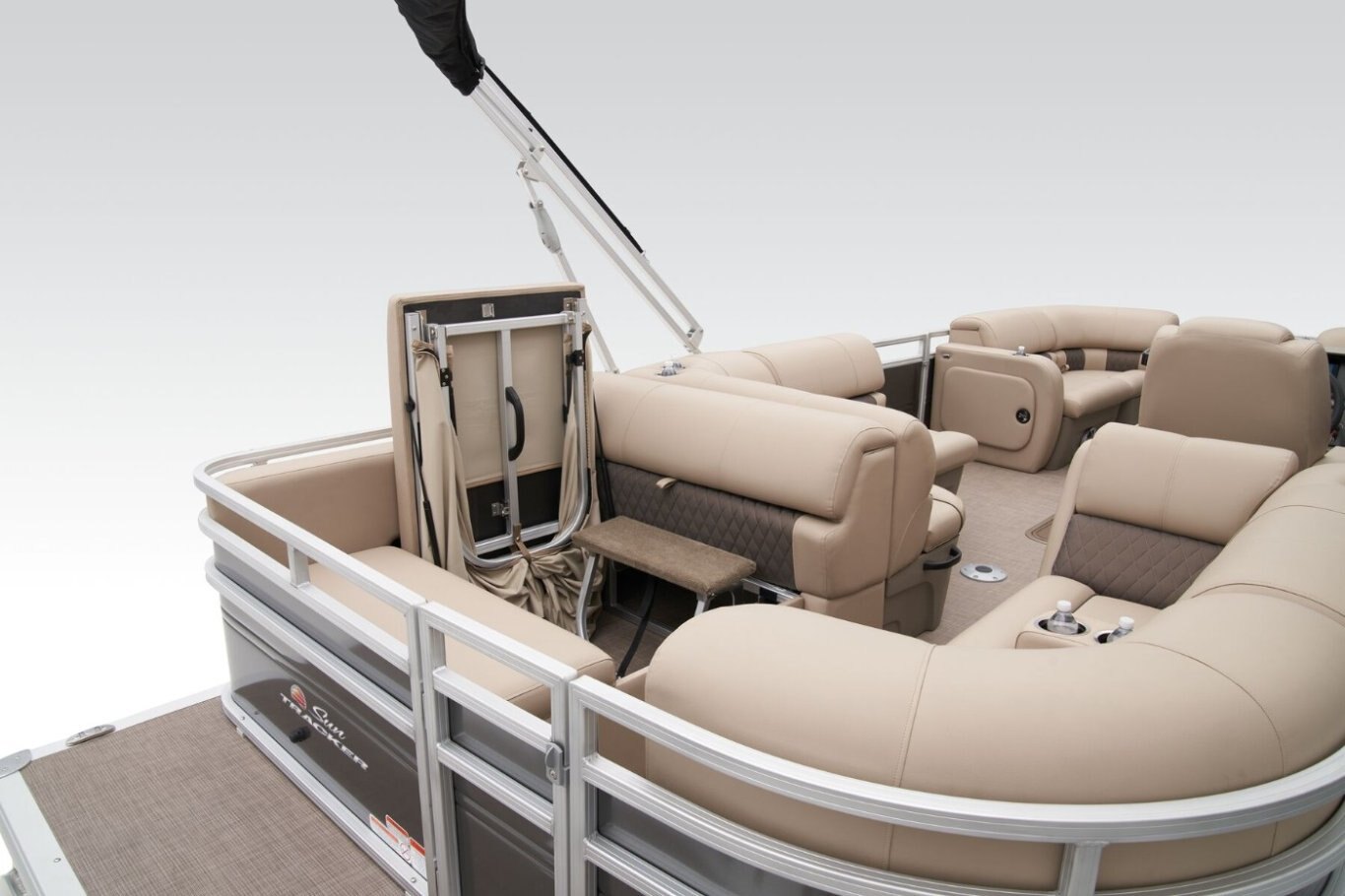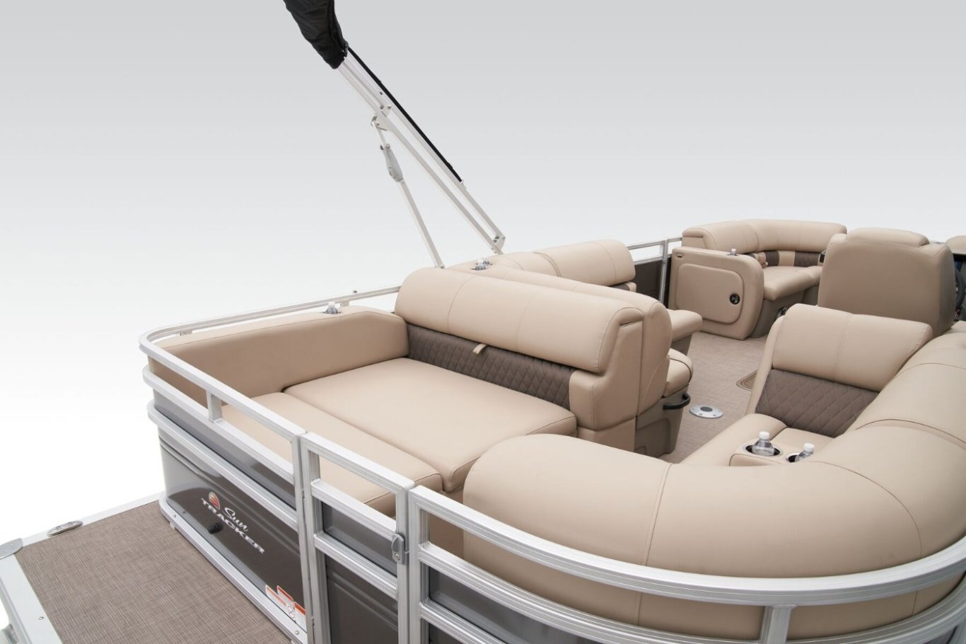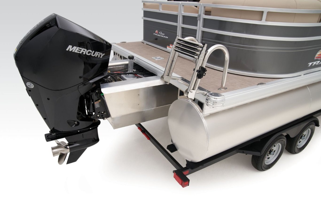Create your ideal lake hangout space with the 2025 PARTY BARGE® 22 RF XP3! The difference between this and its non-RF sibling is that it has a rear-facing aft lounge area perfect for relaxing. Like its sibling, this PARTY BARGE® allows 11 people on board for hours of fun on the water. Take your pick of any of the 5 lounge seats, or take control in the comfortable, swiveling captain's chair. The STOW MORE™ seat-back and under-seat storage areas allow you to organize and secure everything you need for the day's trip. Between standard features such as the full-width swim decks, 10' QuickLift® bimini top, and 4-speaker Wet Sounds® stereo with Bluetooth®, this SUN TRACKER® pontoon boat gives you everything you need to get hours of fun with your favorite people. The back swim deck has a 4-step telescoping boarding ladder for getting back in the boat after taking dips in the water. This pontoon gets increased performance with the addition of a third pontoon log, as well as lifting strakes, underpinning, and hydraulic steering. The PARTY BARGE® 22 XP3 comes standard with a 150hp Mercury® L FourStroke outboard motor and has a recommended maximum 200hp rating. |